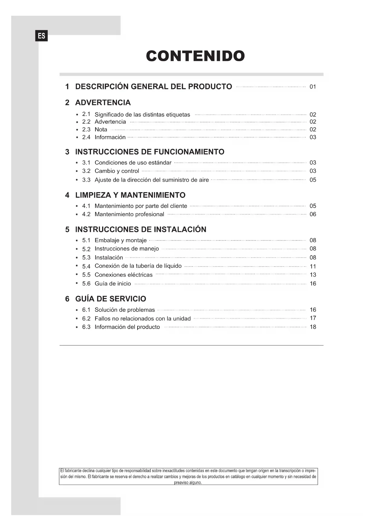 Embalaje y montaje Instrucciones de manejo Instalación Conexión de la tubería de líquido Conexiones eléctricas Guía de inicio