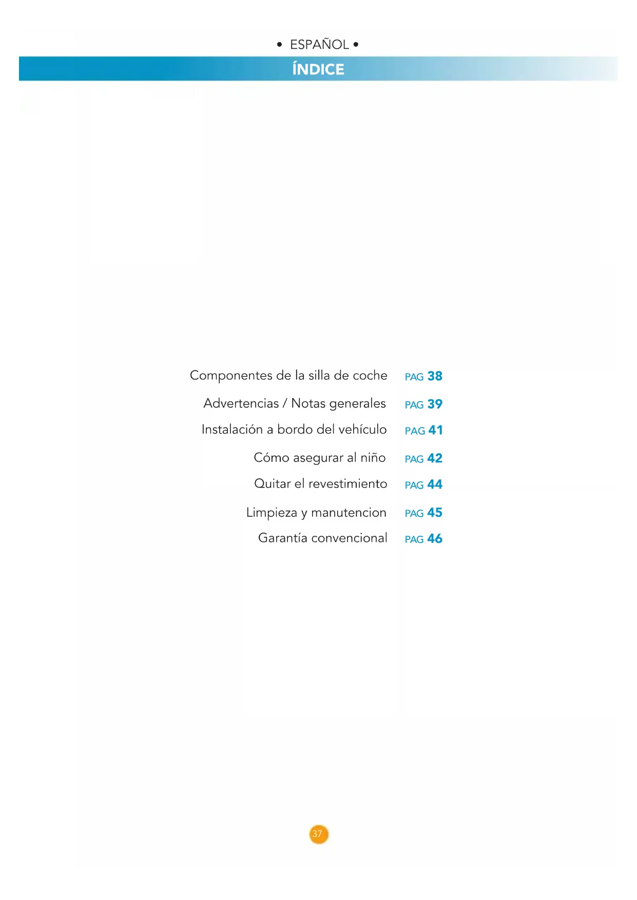 - FRANÇAIS • GARANTIE CONVENTIONNELLE Componentes de la silla de coche Advertencias / Notas generales Instalación a bordo del vehículo Cómo asegurar al niño Quitar el revestimiento Limpieza y manutencion Garantía convencional ÍNDICE PAG 38 PAG 39 PAG 41 PAG 42 PAG 44 PAG 45