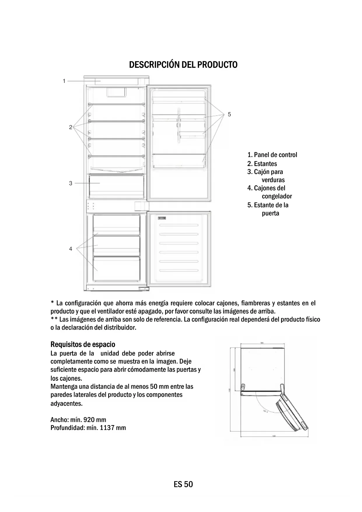 Requisitos de espacio La puerta de la unidad debe poder abrirse completamente como se muestra en la imagen. Deje suficiente espacio para abrir cómodamente las puertas y los cajones. Mantenga una distancia de al menos 50 mm entre las paredes laterales del producto y los componentes adyacentes. Ancho: mín. 920 mm Profundidad: mín. 1137 mmES 51 USO A. Tecla de ENCENDIDO/APAGADO, sirve para encender y apagar el electro–doméstico. B. Tecla Wi-Fi, sirve para activar/desactivar el Wi-Fi. C. Tecla SET, sirve para seleccionar las funciones especiales (Eco y vacaciones). D. Tecla TEMP, sirve para seleccionar la temperatura del frigorífico y el congelador. a. Icono de la zona de frigorífico / congelador, que indica qué compartimento del aparato está seleccionado. b. Niveles de temperatura, indica la temperatura seleccionada. c. Icono Súper Fresco, que indica si la función está activada. d. Niveles de temperatura del congelador, que indica la temperatura seleccionada en el congelador. e. Icono Súper Congelación, que indica si la función está activada. f. Icono de temperatura personalizado, que indica si la temperatura ha sido seleccionada mediante la aplicación. g. Icono del modo Eco, que indica si el modo eco está activado. h. Icono de la función de vacaciones, que indica si la función de vacaciones está activada.