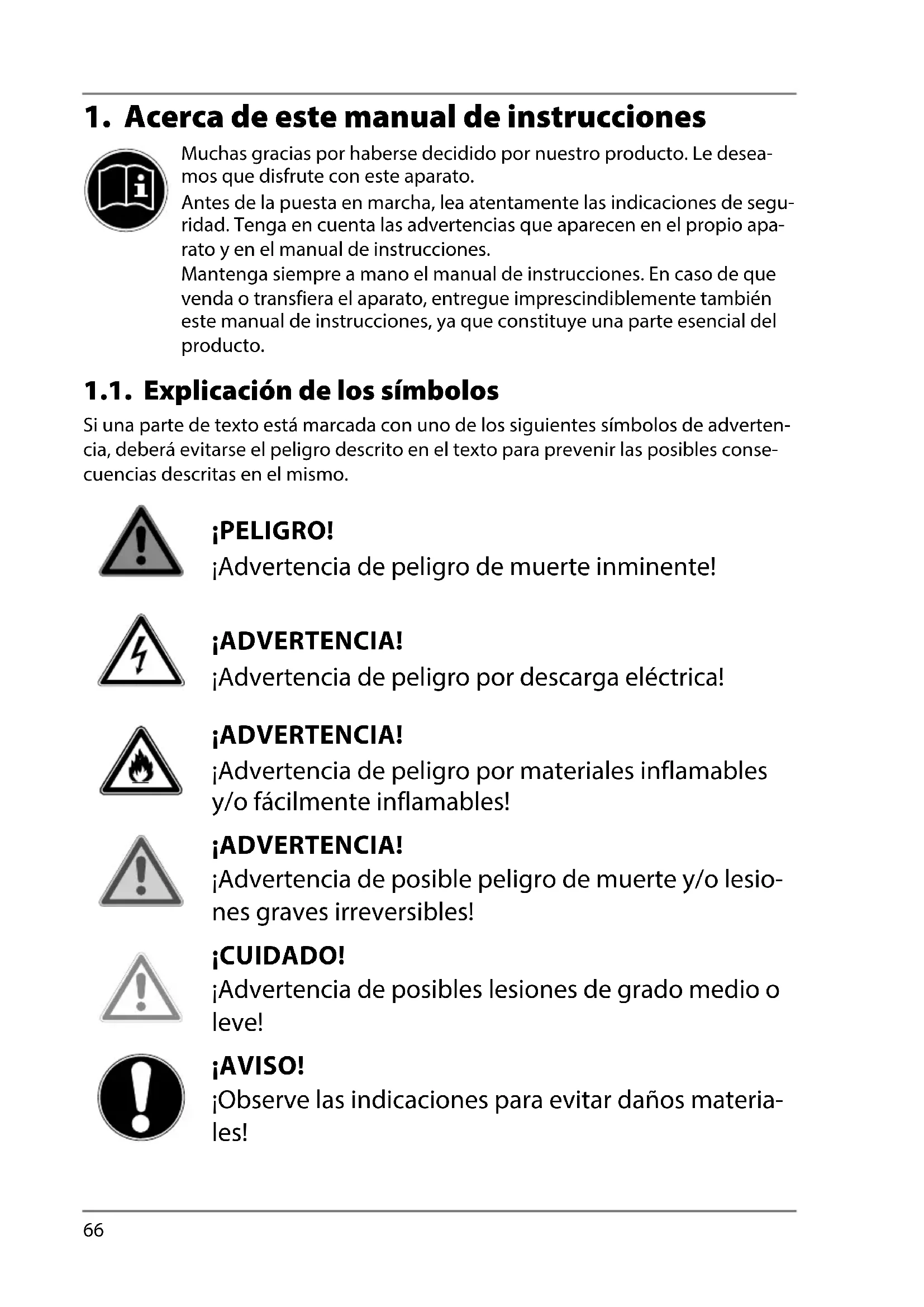 Muchas gracias por haberse decidido por nuestro producto. Le desea- mos que disfrute con este aparato. Antes de la puesta en marcha, lea atentamente las indicaciones de segu- ridad. Tenga en cuenta las advertencias que aparecen en el propio apa- rato y en el manual de instrucciones. Mantenga siempre a mano el manual de instrucciones. En caso de que venda o transfiera el aparato, entregue imprescindiblemente también este manual de instrucciones, ya que constituye una parte esencial del producto. 1.1. Explicación de los símbolos Si una parte de texto está marcada con uno de los siguientes símbolos de adverten- cia, deberá evitarse el peligro descrito en el texto para prevenir las posibles conse- cuencias descritas en el mismo. ¡PELIGRO! ¡Advertencia de peligro de muerte inminente! ¡ADVERTENCIA! ¡Advertencia de peligro por descarga eléctrica! ¡ADVERTENCIA! ¡Advertencia de peligro por materiales inflamables y/o fácilmente inflamables! ¡ADVERTENCIA! ¡Advertencia de posible peligro de muerte y/o lesio- nes graves irreversibles! ¡CUIDADO! ¡Advertencia de posibles lesiones de grado medio o leve! ¡AVISO! ¡Observe las indicaciones para evitar daños materia- les!67
