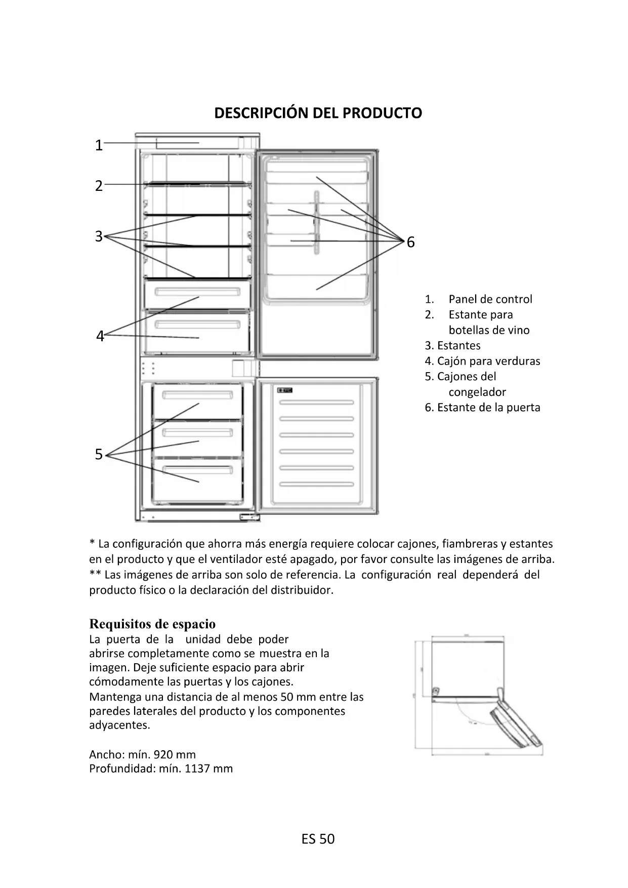 - La configuración que ahorra más energía requiere colocar cajones, fiambreras y estantes en el producto y que el ventilador esté apagado, por favor consulte las imágenes de arriba.** Las imágenes de arriba son solo de referencia. La configuración real dependerá del producto físico o la declaración del distribuidor.Requisitos de espacio La puerta de la unidad debe poder abrirse completamente como se muestra en la imagen. Deje suficiente espacio para abrir cómodamente las puertas y los cajones. Mantenga una distancia de al menos 50 mm entre las paredes laterales del producto y los componentes adyacentes.Ancho: mín. 920 mmProfundidad: mín. 1137 mm