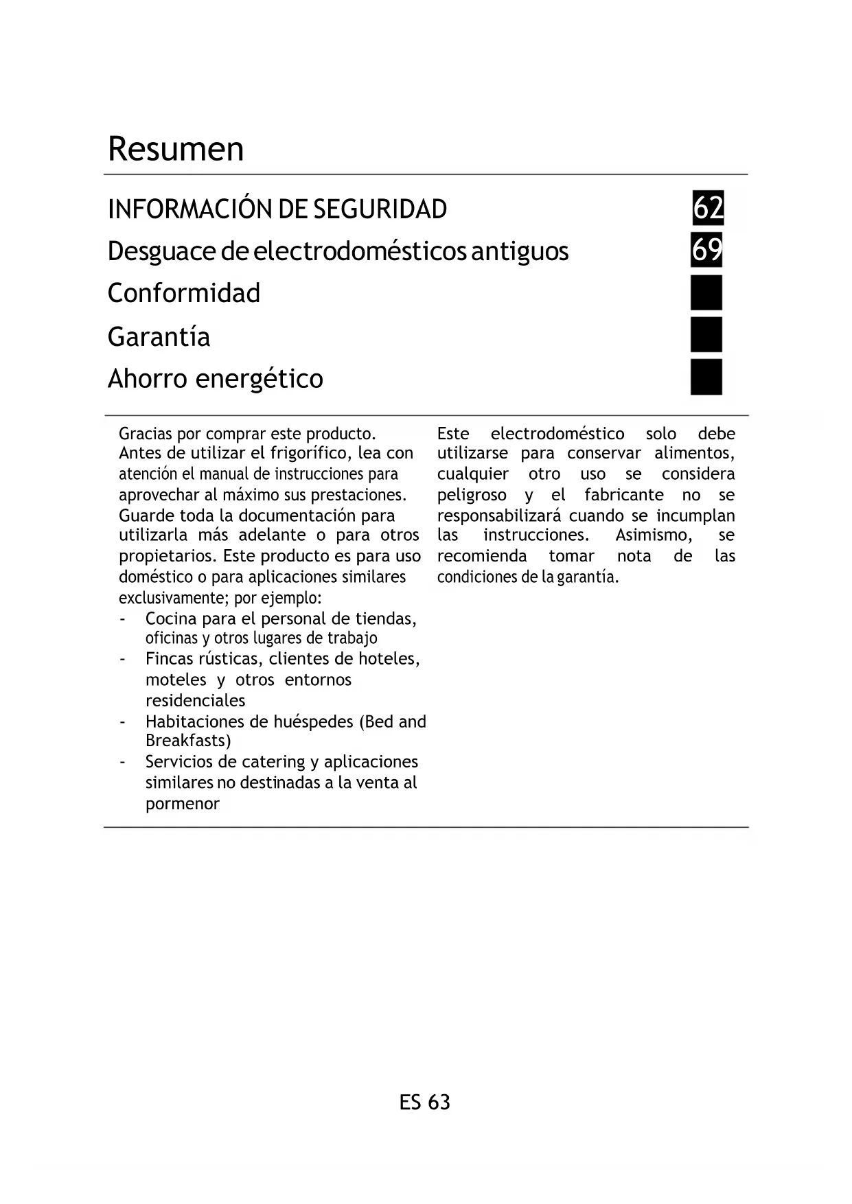Servicios de catering y aplicaciones similares no destinadas a la venta al pormenor Este electrodoméstico solo debe utilizarse para conservar alimentos, cualquier otro uso se considera peligroso y el fabricante no se responsabilizará cuando se incumplan las instrucciones. Asimismo, se recomienda tomar nota de las condiciones de la garantía.ES 64