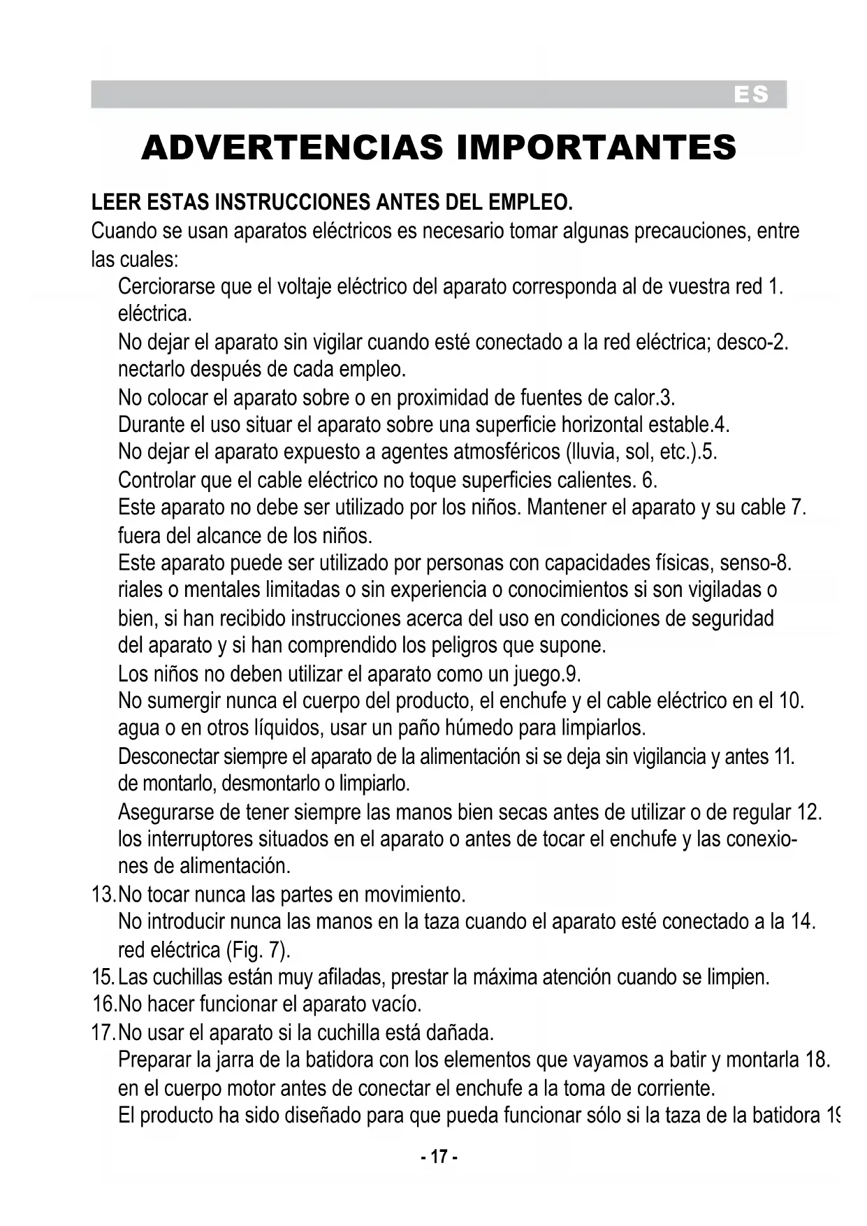 ADVERTENCIAS IMPORTANTES LEER ESTAS INSTRUCCIONES ANTES DEL EMPLEO. Cuando se usan aparatos eléctricos es necesario tomar algunas precauciones, entre las cuales: Cerciorarse que el voltaje eléctrico del aparato corresponda al de vuestra red 1. eléctrica. No dejar el aparato sin vigilar cuando esté conectado a la red eléctrica; desco-2. nectarlo después de cada empleo. No colocar el aparato sobre o en proximidad de fuentes de calor.3. Durante el uso situar el aparato sobre una superficie horizontal estable.4. No dejar el aparato expuesto a agentes atmosféricos (lluvia, sol, etc.).5. Controlar que el cable eléctrico no toque superficies calientes. 6. Este aparato no debe ser utilizado por los niños. Mantener el aparato y su cable 7. fuera del alcance de los niños. Este aparato puede ser utilizado por personas con capacidades físicas, senso-8. riales o mentales limitadas o sin experiencia o conocimientos si son vigiladas o bien, si han recibido instrucciones acerca del uso en condiciones de seguridad del aparato y si han comprendido los peligros que supone. Los niños no deben utilizar el aparato como un juego.9. No sumergir nunca el cuerpo del producto, el enchufe y el cable eléctrico en el 10. agua o en otros líquidos, usar un paño húmedo para limpiarlos. Desconectar siempre el aparato de la alimentación si se deja sin vigilancia y antes 11. de montarlo, desmontarlo o limpiarlo. Asegurarse de tener siempre las manos bien secas antes de utilizar o de regular 12. los interruptores situados en el aparato o antes de tocar el enchufe y las conexio- nes de alimentación. No tocar nunca las partes en movimiento.13. No introducir nunca las manos en la taza cuando el aparato esté conectado a la 14. red eléctrica (Fig. 7). Las cuchillas están muy afiladas, prestar la máxima atención cuando se limpien.15. No hacer funcionar el aparato vacío. 16. No usar el aparato si la cuchilla está dañada.17. Preparar la jarra de la batidora con los elementos que vayamos a batir y montarla 18. en el cuerpo motor antes de conectar el enchufe a la toma de corriente. El producto ha sido diseñado para que pueda funcionar sólo si la taza de la batidora 19.ES
