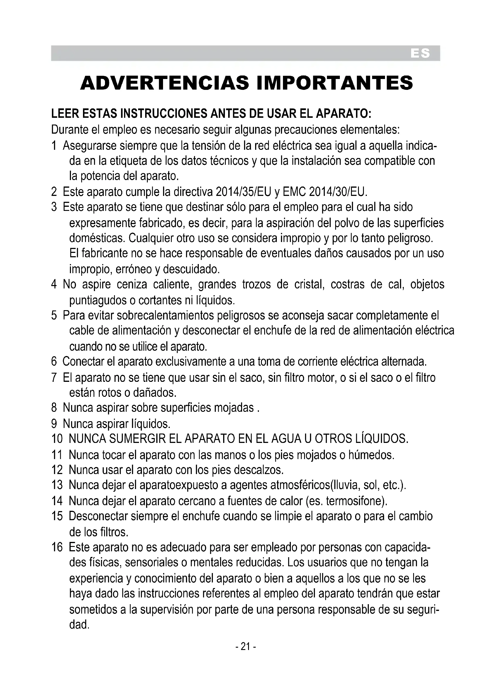 ADVERTENCIAS IMPORTANTES LEER ESTAS INSTRUCCIoNES ANTES DE USAR EL APARATo: Durante el empleo es necesario seguir algunas precauciones elementales: 1 Asegurarse siempre que la tensión de la red eléctrica sea igual a aquella indica- da en la etiqueta de los datos técnicos y que la instalación sea compatible con la potencia del aparato. 2 Este aparato cumple la directiva 2014/35/EU y EMC 2014/30/EU. 3 Este aparato se tiene que destinar sólo para el empleo para el cual ha sido expresamente fabricado, es decir, para la aspiración del polvo de las superficies domésticas. Cualquier otro uso se considera impropio y por lo tanto peligroso. El fabricante no se hace responsable de eventuales daños causados por un uso impropio, erróneo y descuidado. 4 No aspire ceniza caliente, grandes trozos de cristal, costras de cal, objetos puntiagudos o cortantes ni líquidos. 5 Para evitar sobrecalentamientos peligrosos se aconseja sacar completamente el cable de alimentación y desconectar el enchufe de la red de alimentación eléctrica cuando no se utilice el aparato. 6 Conectar el aparato exclusivamente a una toma de corriente eléctrica alternada. 7 El aparato no se tiene que usar sin el saco, sin filtro motor, o si el saco o el filtro están rotos o dañados. 8 Nunca aspirar sobre superficies mojadas . 9 Nunca aspirar líquidos. 10 NUNCA SUMERGIR EL APARATO EN EL AGUA U OTROS LÍQUIDOS. 11 Nunca tocar el aparato con las manos o los pies mojados o húmedos. 12 Nunca usar el aparato con los pies descalzos. 13 Nunca dejar el aparatoexpuesto a agentes atmosféricos(lluvia, sol, etc.). 14 Nunca dejar el aparato cercano a fuentes de calor (es. termosifone). 15 Desconectar siempre el enchufe cuando se limpie el aparato o para el cambio de los filtros. 16 Este aparato no es adecuado para ser empleado por personas con capacida- des físicas, sensoriales o mentales reducidas. Los usuarios que no tengan la experiencia y conocimiento del aparato o bien a aquellos a los que no se les haya dado las instrucciones referentes al empleo del aparato tendrán que estar sometidos a la supervisión por parte de una persona responsable de su seguri- dad.ES