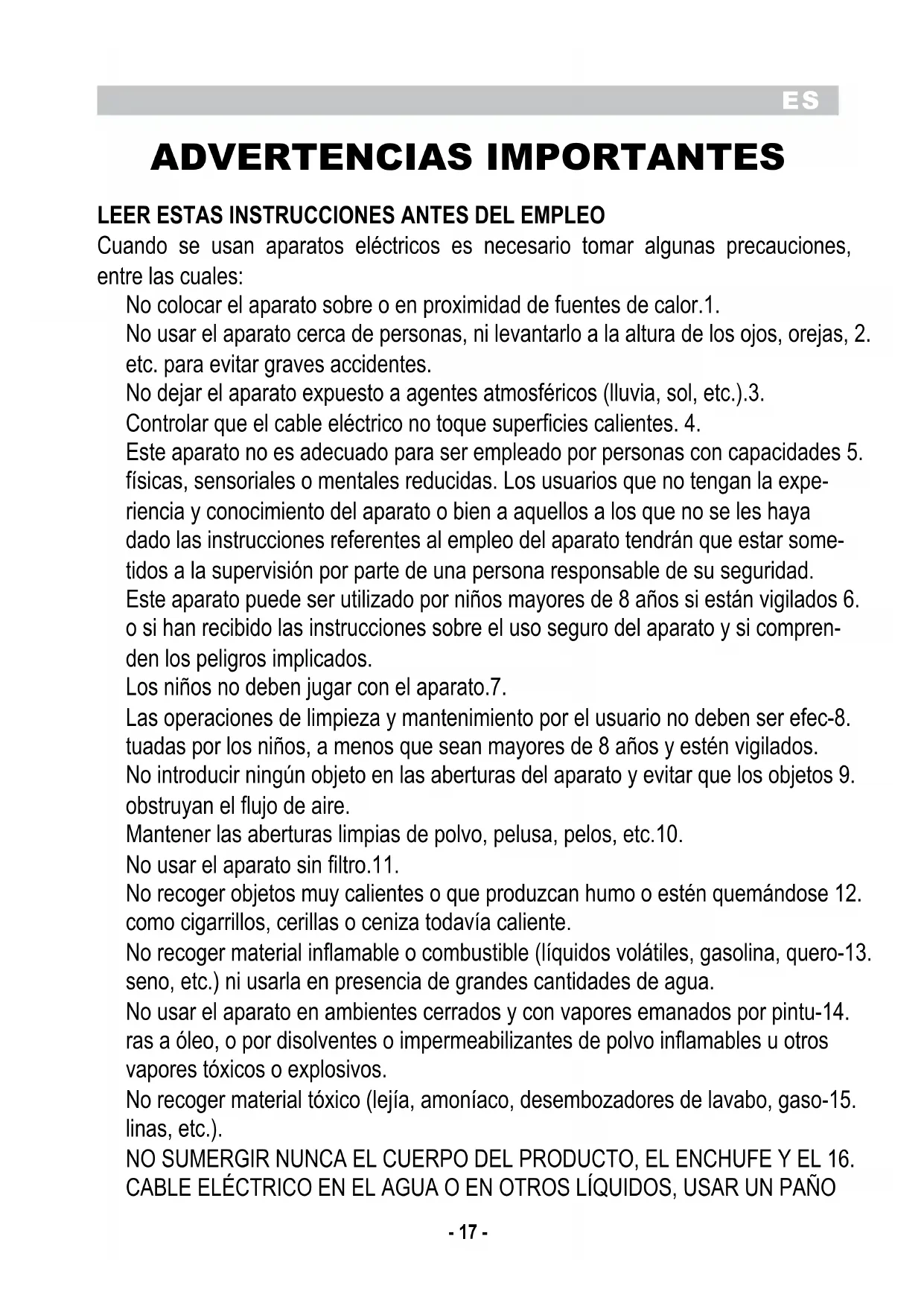 Cuando se usan aparatos eléctricos es necesario tomar algunas precauciones, entre las cuales: No colocar el aparato sobre o en proximidad de fuentes de calor.1. No usar el aparato cerca de personas, ni levantarlo a la altura de los ojos, orejas, 2. etc. para evitar graves accidentes. No dejar el aparato expuesto a agentes atmosféricos (lluvia, sol, etc.).3. Controlar que el cable eléctrico no toque superficies calientes. 4. Este aparato no es adecuado para ser empleado por personas con capacidades 5. físicas, sensoriales o mentales reducidas. Los usuarios que no tengan la expe- riencia y conocimiento del aparato o bien a aquellos a los que no se les haya dado las instrucciones referentes al empleo del aparato tendrán que estar some- tidos a la supervisión por parte de una persona responsable de su seguridad. Este aparato puede ser utilizado por niños mayores de 8 años si están vigilados 6. o si han recibido las instrucciones sobre el uso seguro del aparato y si compren- den los peligros implicados. Los niños no deben jugar con el aparato.7. Las operaciones de limpieza y mantenimiento por el usuario no deben ser efec-8. tuadas por los niños, a menos que sean mayores de 8 años y estén vigilados. No introducir ningún objeto en las aberturas del aparato y evitar que los objetos 9. obstruyan el flujo de aire. Mantener las aberturas limpias de polvo, pelusa, pelos, etc.10. No usar el aparato sin filtro.11. No recoger objetos muy calientes o que produzcan humo o estén quemándose 12. como cigarrillos, cerillas o ceniza todavía caliente. No recoger material inflamable o combustible (líquidos volátiles, gasolina, quero-13. seno, etc.) ni usarla en presencia de grandes cantidades de agua. No usar el aparato en ambientes cerrados y con vapores emanados por pintu-14. ras a óleo, o por disolventes o impermeabilizantes de polvo inflamables u otros vapores tóxicos o explosivos. No recoger material tóxico (lejía, amoníaco, desembozadores de lavabo, gaso-15. linas, etc.). NO SUMERGIR NUNCA EL CUERPO DEL PRODUCTO, EL ENCHUFE Y EL 16. CABLE ELÉCTRICO EN EL AGUA O EN OTROS LÍQUIDOS, USAR UN PAÑOES