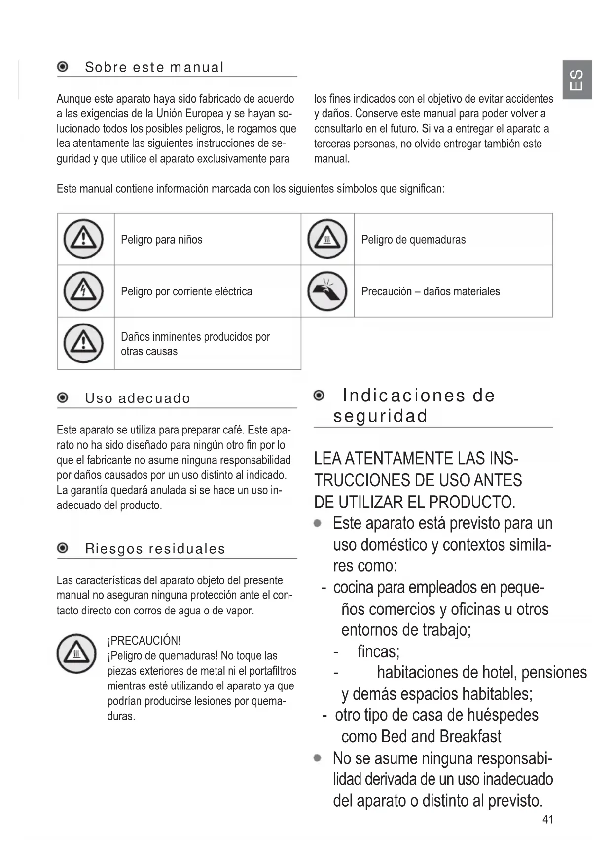 Sobre este manual AunTue este aparato haya sido faEricado de acuerdo a las e[igencias de la 8nión Europea y se hayan so- lucionado todos los posiEles peligros, le rogamos Tue lea atentamente las siguientes instrucciones de se- guridad y Tue utilice el aparato e[clusivamente para los ¿nes indicados con el oEMetivo de evitar accidentes y daxos &onserve este manual para poder volver a consultarlo en el futuro Si va a entregar el aparato a terceras personas, no olvide entregar tamEién este manual Este manual contiene información marcada con los siguientes stmEolos Tue signi¿can Peligro para nixos Peligro de Tuemaduras Peligro por corriente eléctrica Precaución ± daxos materiales Daxos inminentes producidos por otras causas Uso adecuado Este aparato se utiliza para preparar café Este apa- rato no ha sido disexado para ning~n otro ¿n por lo Tue el faEricante no asume ninguna responsaEilidad por daxos causados por un uso distinto al indicado La garantta Tuedará anulada si se hace un uso in- adecuado del producto Riesgos residuales Las caractertsticas del aparato oEMeto del presente manual no aseguran ninguna protección ante el con- tacto directo con corros de agua o de vapor