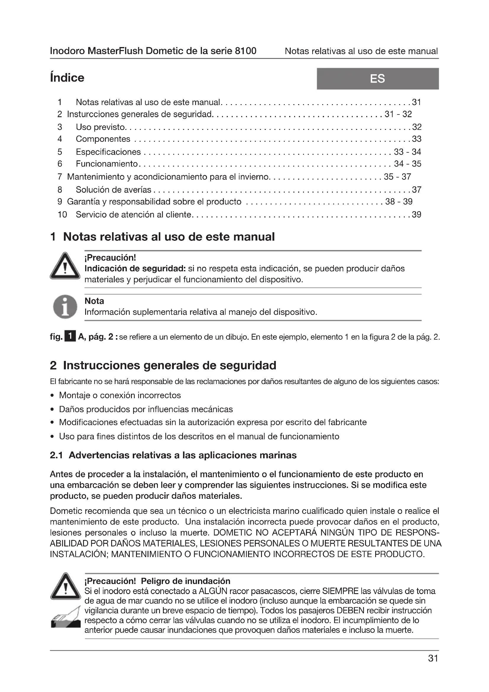 - Uso para nes distintos de los descritos en el manual de funcionamiento Inodoro MasterFlush Dometic de la serie 8100 Notas relativas al uso de este manual ¡Precaución! Peligro de inundación Si el inodoro está conectado a ALGÚN racor pasacascos, cierre SIEMPRE las válvulas de toma de agua de mar cuando no se utilice el inodoro (incluso aunque la embarcación se quede sin vigilancia durante un breve espacio de tiempo). Todos los pasajeros DEBEN recibir instrucción respecto a cómo cerrar las válvulas cuando no se utiliza el inodoro. El incumplimiento de lo anterior puede causar inundaciones que provoquen daños materiales e incluso la muerte.32 Instrucciones generales de seguridad Inodoro MasterFlush Dometic de la serie 8100 ¡Precaución! Peligro de inundación Si el inodoro utiliza agua fresca para la cisterna y en ALGÚN momento está conectado, directa o indirectamente, a una red pública de agua, estas tomas de agua se DEBERÁN desconectar si se deja la embarcación sin vigilancia (aunque sólo sea durante un breve espacio de tiempo). El incumplimiento de lo anterior puede causar inundaciones que provoquen daños materiales e incluso la muerte. ¡Precaución! Peligro de inundación Antes de proceder a cualquier trabajo en este producto, asegúrese de que la unidad esté desconectada de la alimentación eléctrica y de que las válvulas de toma de agua de mar están en la posición CERRADO u OFF. El incumplimiento de lo anterior puede causar inundaciones que provoquen daños materiales e incluso la muerte. 3 Uso previsto El inodoro MasterFlush de la serie 8100 de Dometic tiene un sistema de cisterna automática que macera los residuos y los bombea a un depósito de retención o a algún otro sistema de almace- namiento o gestión de residuos. Un pulsador instalado en la pared para activar la cisterna permite al usuario añadir agua a la taza (antes o después de vaciar la cisterna) y vaciar la cisterna presionando el pulsador.