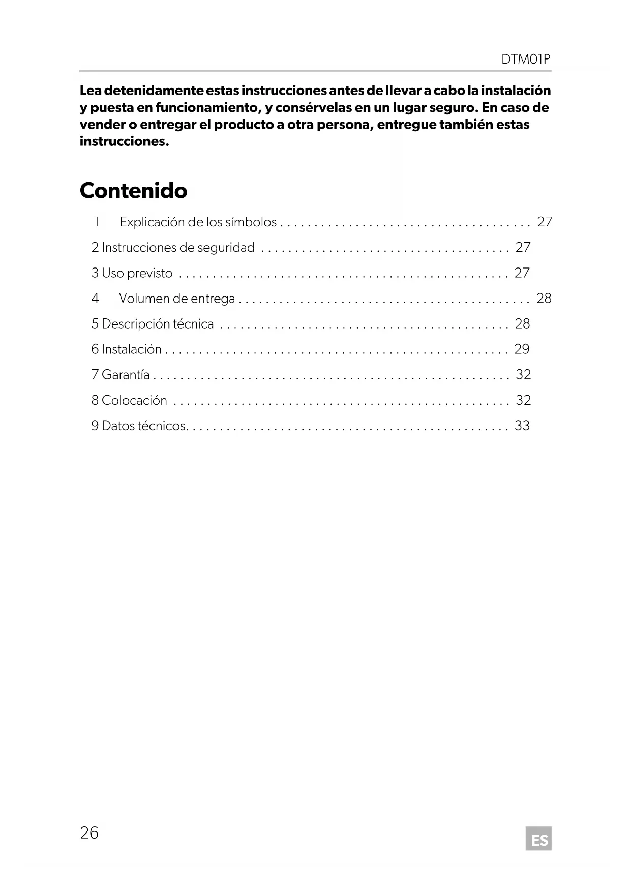 - Lea detenidamente estas instrucciones antes de llevar a cabo la instalación y puesta en funcionamiento, y consérvelas en un lugar seguro. En caso de vender o entregar el producto a otra persona, entregue también estas instrucciones. Contenido 1 Explicación de los símbolos p. 27