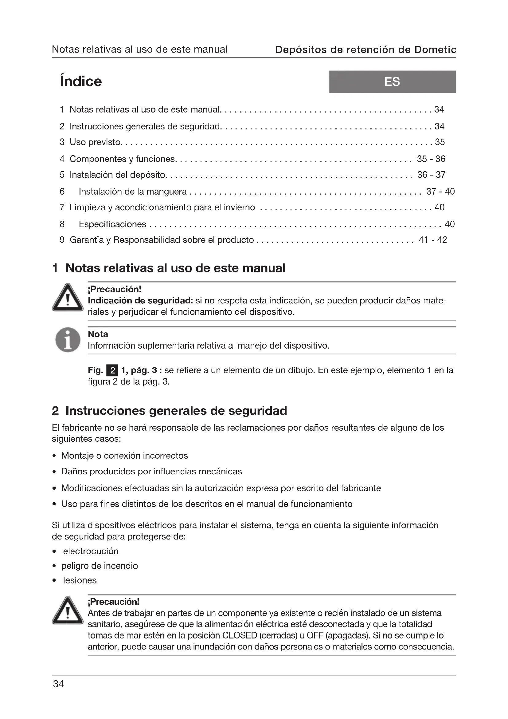 - 9 Garantîa y Responsabilidad sobre el producto - 42 1 Notas relativas al uso de este manual Nota Información suplementaria relativa al manejo del dispositivo. Fig. 1, pág. 3 : se reere a un elemento de un dibujo. En este ejemplo, elemento 1 en la gura 2 de la pág. 3. p. 41