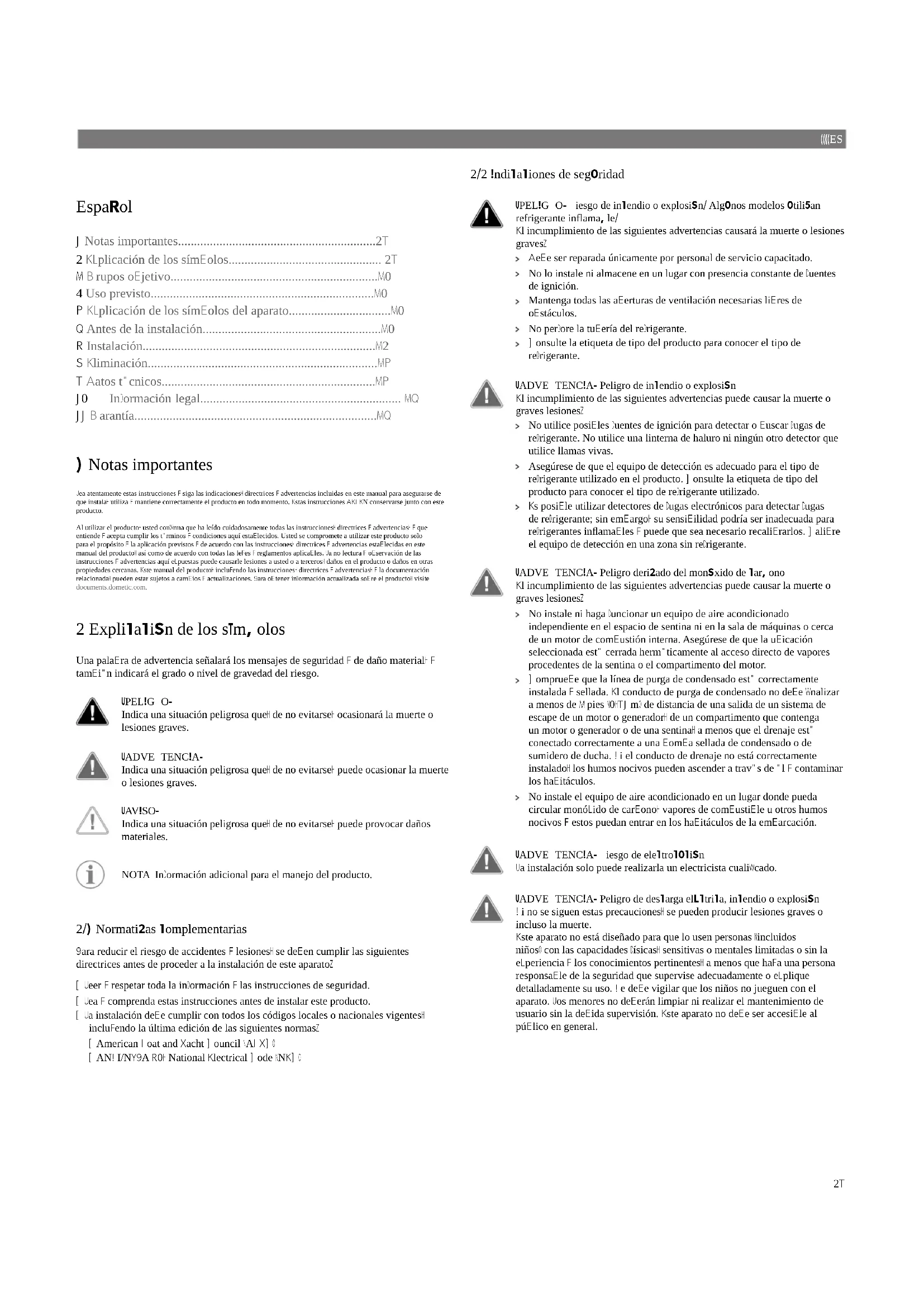¡PELIGRO! Riesgo de incendio o explosión. Algunos modelos utilizan refrigerante inflamable. El incumplimiento de las siguientes advertencias causará la muerte o lesiones graves: Debe ser reparada únicamente por personal de servicio capacitado. No lo instale ni almacene en un lugar con presencia constante de fuentes de ignición. Mantenga todas las aberturas de ventilación necesarias libres de obstáculos. No perfore la tubería del refrigerante. Consulte la etiqueta de tipo del producto para conocer el tipo de refrigerante. ¡ADVERTENCIA! Peligro de incendio o explosión El incumplimiento de las siguientes advertencias puede causar la muerte o graves lesiones: No utilice posibles fuentes de ignición para detectar o buscar fugas de refrigerante. No utilice una linterna de haluro ni ningún otro detector que utilice llamas vivas. Asegúrese de que el equipo de detección es adecuado para el tipo de refrigerante utilizado en el producto. Consulte la etiqueta de tipo del producto para conocer el tipo de refrigerante utilizado. Es posible utilizar detectores de fugas electrónicos para detectar fugas de refrigerante; sin embargo, su sensibilidad podría ser inadecuada para refrigerantes inflamables y puede que sea necesario recalibrarlos. Calibre el equipo de detección en una zona sin refrigerante. ¡ADVERTENCIA! Peligro derivado del monóxido de carbono El incumplimiento de las siguientes advertencias puede causar la muerte o graves lesiones: No instale ni haga funcionar un equipo de aire acondicionado independiente en el espacio de sentina ni en la sala de máquinas o cerca de un motor de combustión interna. Asegúrese de que la ubicación seleccionada esté cerrada herméticamente al acceso directo de vapores procedentes de la sentina o el compartimento del motor. Compruebe que la línea de purga de condensado esté correctamente instalada y sellada. El conducto de purga de condensado no debe finalizar a menos de 3pies (0,91m) de distancia de una salida de un sistema de escape de un motor o generador, de un compartimento que contenga un motor o generador o de una sentina, a menos que el drenaje esté conectado correctamente a una bomba sellada de condensado o de sumidero de ducha. Si el conducto de drenaje no está correctamente instalado, los humos nocivos pueden ascender a través de él y contaminar los habitáculos. No instale el equipo de aire acondicionado en un lugar donde pueda circular monóxido de carbono, vapores de combustible u otros humos nocivos y estos puedan entrar en los habitáculos de la embarcación. ¡ADVERTENCIA! Riesgo de electrocución La instalación solo puede realizarla un electricista cualificado. ¡ADVERTENCIA! Peligro de descarga eléctrica, incendio o explosión Si no se siguen estas precauciones, se pueden producir lesiones graves o incluso la muerte. Este aparato no está diseñado para que lo usen personas (incluidos niños) con las capacidades físicas, sensitivas o mentales limitadas o sin la experiencia y los conocimientos pertinentes, a menos que haya una persona responsable de la seguridad que supervise adecuadamente o explique detalladamente su uso. Se debe vigilar que los niños no jueguen con el aparato. Los menores no deberán limpiar ni realizar el mantenimiento de usuario sin la debida supervisión. Este aparato no debe ser accesible al público en general. 29ES ¡ADVERTENCIA! Peligro de explosión Si no se siguen estas precauciones, se pueden producir lesiones graves o incluso la muerte. No instale el equipo de aire acondicionado en un lugar donde haya motores de gasolina, tanques, bombonas de GLP/GNC, reguladores, válvulas o accesorios de la línea de combustible. A menos que se indique lo contrario en la etiqueta, las unidades independientes no cumplen con los requisitos federales de protección antideflagrante. El incumplimiento de esta advertencia puede ocasionar la muerte o lesiones graves. Los componentes eléctricos que puedan provocar arcos eléctricos o chispas solo se deben sustituir por piezas especificadas por el fabricante del aparato. La sustitución por otras piezas puede provocar la ignición del refrigerante en caso de fuga. ¡ADVERTENCIA! Peligro de descarga eléctrica Si no se siguen estas precauciones, se pueden producir lesiones graves o incluso la muerte. Asegúrese de que el equipo de aire acondicionado tenga una conexión a tierra para minimizar el peligro de descargas eléctricas. Consulte las directrices de instalación para obtener más obtener más información. Cada equipo de aire acondicionado instalado requiere un disyuntor específico. Si solo hay un equipo de aire acondicionado instalado, la bomba de agua de mar no necesita disyuntor. Si dos o más unidades de aire acondicionado utilizan la misma bomba de agua de mar, los cables de la bomba se conectarán a un panel de relé de la bomba (PRP), que a su vez tiene su propio disyuntor específico para la bomba (20A máximo). Consulte el diagrama de cableado suministrado con el PRP. Las conexiones eléctricas en la sentina y/o debajo de la línea de flotación deben usar empalmes a tope de tipo termorretráctil. El cableado de campo debe cumplir con los códigos eléctricos ABYC. La alimentación de la unidad debe estar dentro del margen de tensión de funcionamiento indicado en la etiqueta de tipo. Se deben instalar fusibles del tamaño adecuado o interruptores automáticos HACR para la protección de los circuitos de derivación. Consulte en la etiqueta de tipo el amperaje máximo del fusible/disyuntor (MFS) y la capacidad interna mínima (MCA). ¡AVISO! Este aparato contiene gases fluorados de efecto invernadero en equipos herméticamente cerrados. Consulte la etiqueta de tipo del producto de la unidad condensadora para conocer la cantidad de refrigerante indicada en peso y GWP. El refrigerante que se agrega debe ser anotado en la etiqueta de la unidad. ¡AVISO! No utilice el tubo de cobre para empujar, levantar o transportar el producto, ni para tirar 