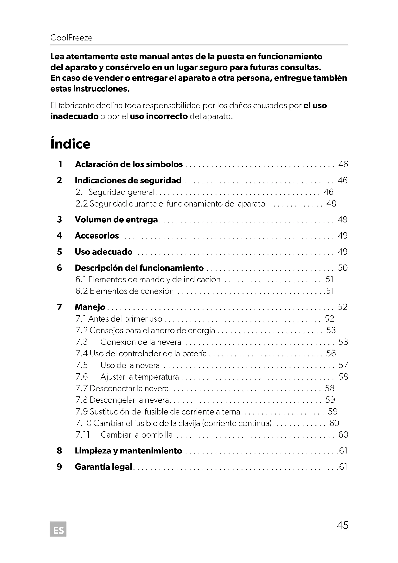 Lea atentamente este manual antes de la puesta en funcionamiento del aparato y consérvelo en un lugar seguro para futuras consultas. En caso de vender o entregar el aparato a otra persona, entregue también estas instrucciones. El fabricante declina toda responsabilidad por los daños causados por el uso inadecuado o por el uso incorrecto del aparato. Índice 1 Aclaración de los símbolos . . . . . . . . . . . . . . . . . . . . . . . . . . . . . . . . . . . 46 2 Indicaciones de seguridad . . . . . . . . . . . . . . . . . . . . . . . . . . . . . . . . . . . 46