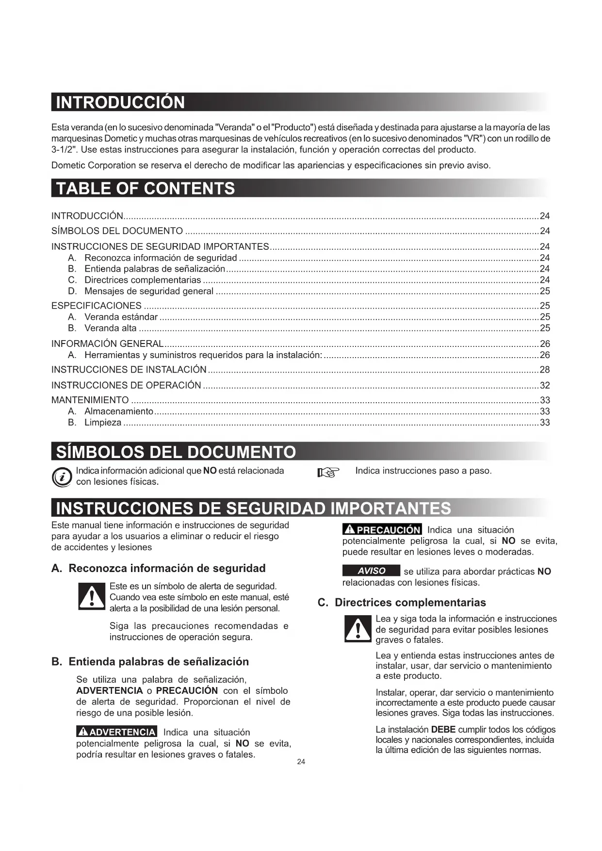 INTRODUCCIÓN Esta veranda (en lo sucesivo denominada "Veranda" o el "Producto") está diseñada y destinada para ajustarse a la mayoría de las marquesinas Dometic y muchas otras marquesinas de vehículos recreativos (en lo sucesivo denominados "VR") con un rodillo de 3-1/2". Use estas instrucciones para asegurar la instalación, función y operación correctas del producto. Dometic Corporation se reserva el derecho de modicar las apariencias y especicaciones sin previo aviso.