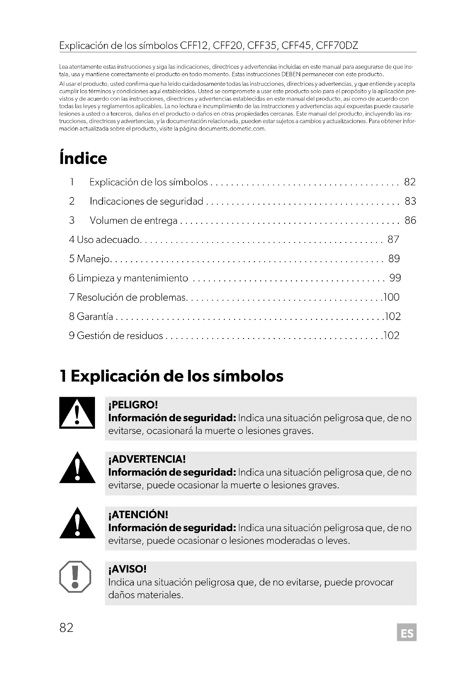 ¡PELIGRO! Información de seguridad: Indica una situación peligrosa que, de no evitarse, ocasionará la muerte o lesiones graves. ¡ADVERTENCIA! Información de seguridad: Indica una situación peligrosa que, de no evitarse, puede ocasionar la muerte o lesiones graves. ¡ATENCIÓN! Información de seguridad: Indica una situación peligrosa que, de no evitarse, puede ocasionar o lesiones moderadas o leves. ¡AVISO! Indica una situación peligrosa que, de no evitarse, puede provocar daños materiales. DometicCFF12-20-35-45-70DZ_OPM_4445103134_EMEA17_202x-xx-xx.book Page 82 Friday, September 16, 2022 12:19 PMES CFF12, CFF20, CFF35, CFF45, CFF70DZ Indicaciones de seguridad