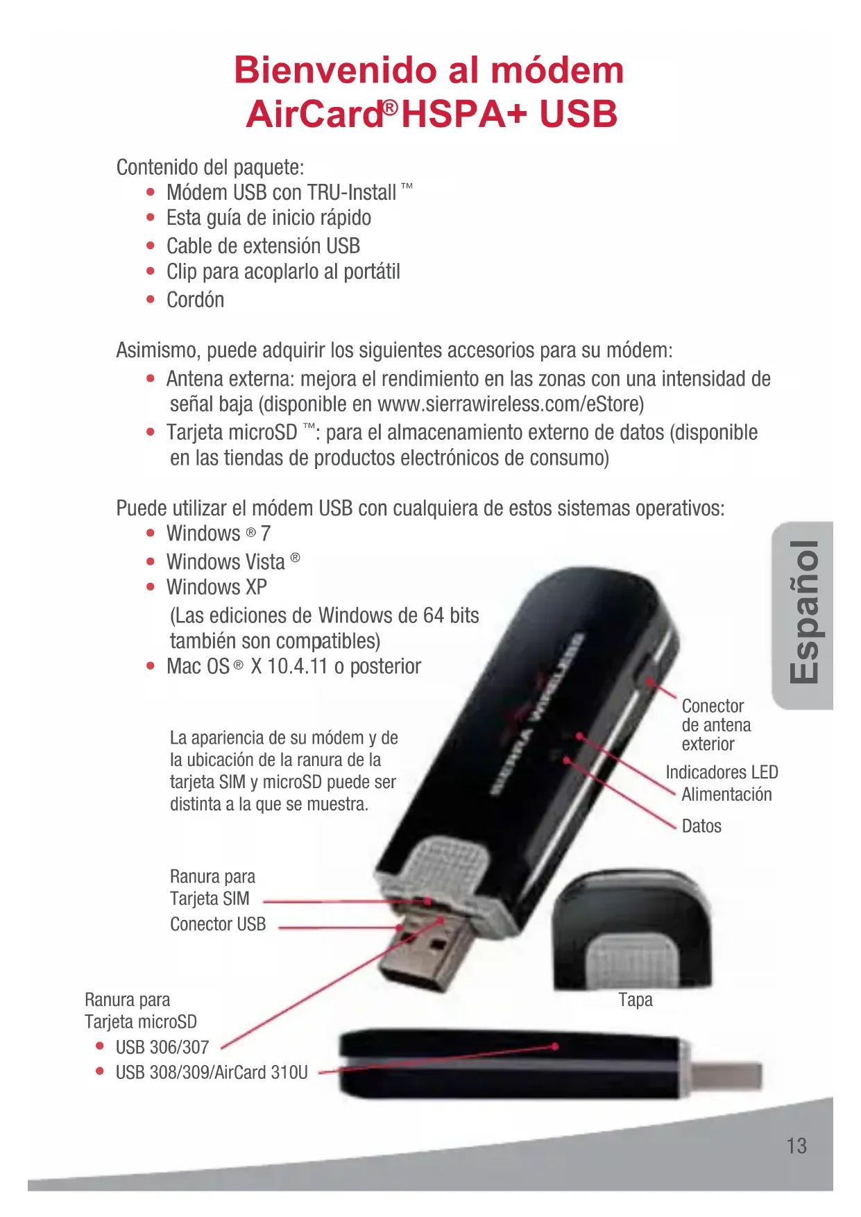 - USB 306/307 La apariencia de su módem y de la ubicación de la ranura de la tarjeta SIM y microSD puede ser distinta a la que se muestra.