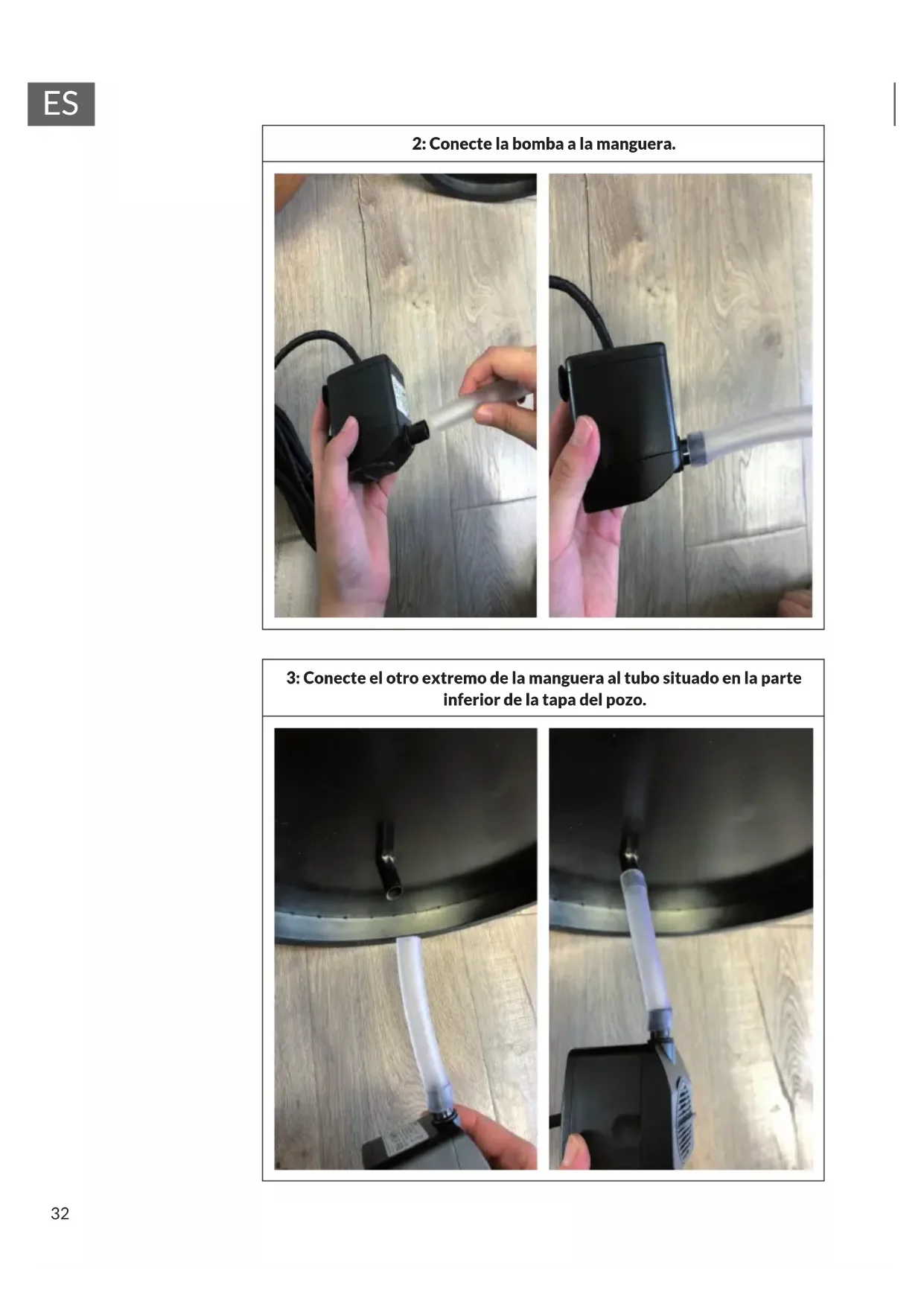 2: Conecte la bomba a la manguera. 3: Conecte el otro extremo de la manguera al tubo situado en la parte inferior de la tapa del pozo.33