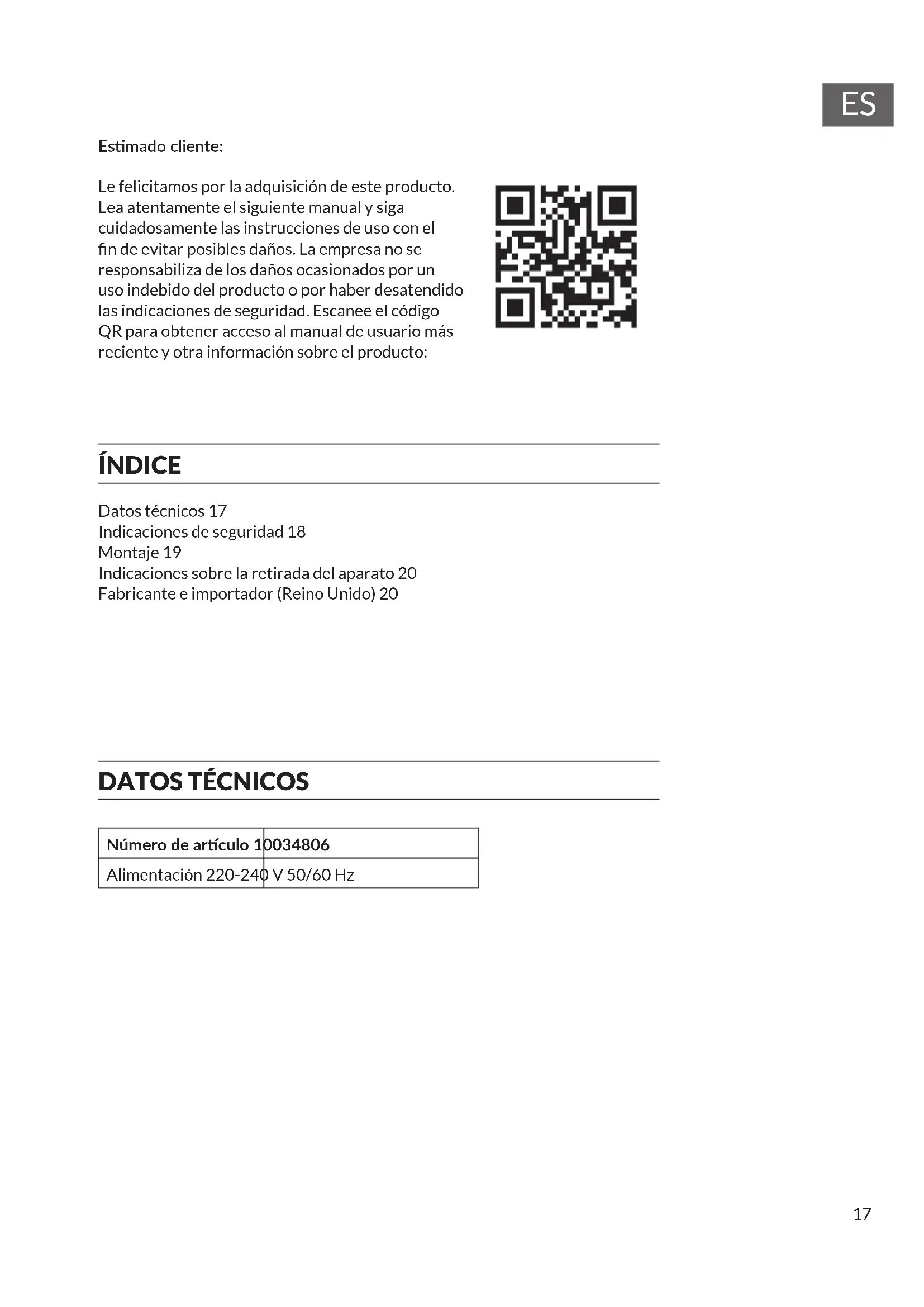 Esmado cliente: Le felicitamos por la adquisición de este producto. Lea atentamente el siguiente manual y siga cuidadosamente las instrucciones de uso con el n de evitar posibles daños. La empresa no se responsabiliza de los daños ocasionados por un uso indebido del producto o por haber desatendido las indicaciones de seguridad. Escanee el código QR para obtener acceso al manual de usuario más reciente y otra información sobre el producto: ÍNDICE Datos técnicos 17 Indicaciones de seguridad 18 Montaje 19 Indicaciones sobre la retirada del aparato 20 Fabricante e importador (Reino Unido) 20