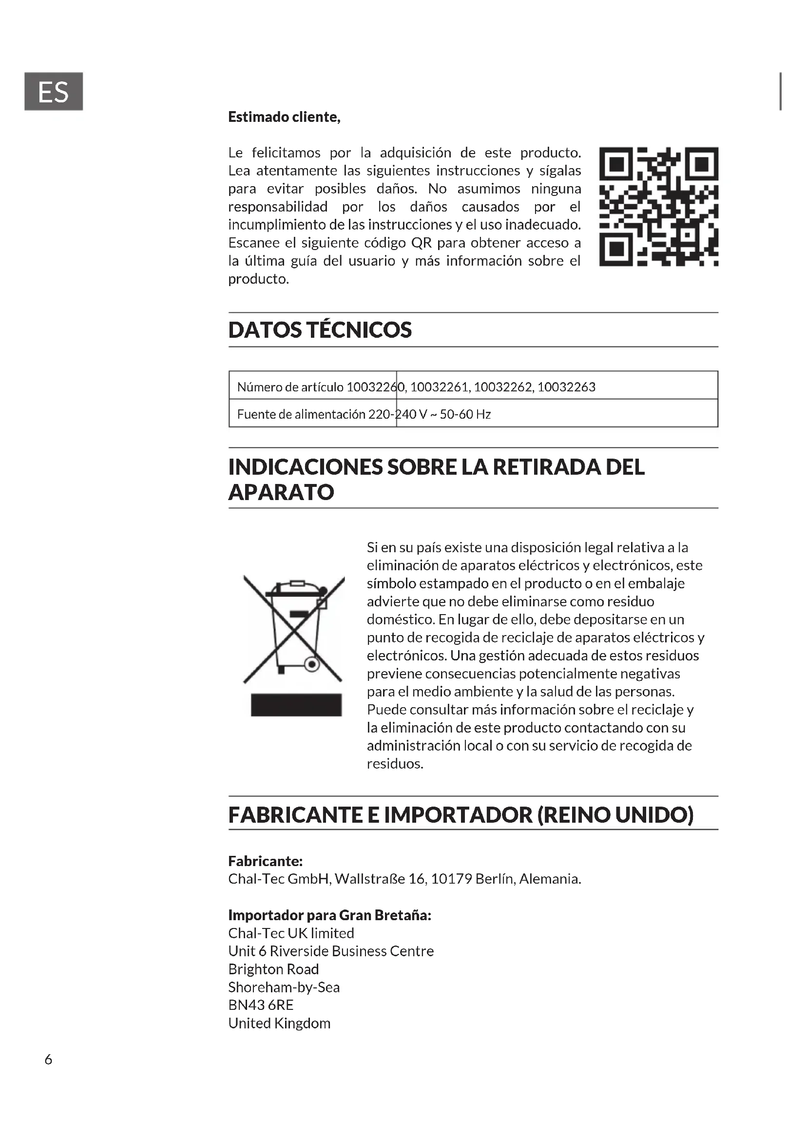APARATO Si en su país existe una disposición legal relativa a la eliminación de aparatos eléctricos y electrónicos, este símbolo estampado en el producto o en el embalaje advierte que no debe eliminarse como residuo doméstico. En lugar de ello, debe depositarse en un punto de recogida de reciclaje de aparatos eléctricos y electrónicos. Una gestión adecuada de estos residuos previene consecuencias potencialmente negativas para el medio ambiente y la salud de las personas. Puede consultar más información sobre el reciclaje y la eliminación de este producto contactando con su administración local o con su servicio de recogida de residuos. FABRICANTE E IMPORTADOR (REINO UNIDO) Fabricante: Chal-Tec GmbH, Wallstraße 16, 10179 Berlín, Alemania. Importador para Gran Bretaña: Chal-Tec UK limited Unit 6 Riverside Business Centre Brighton Road Shoreham-by-Sea BN43 6RE United Kingdom9