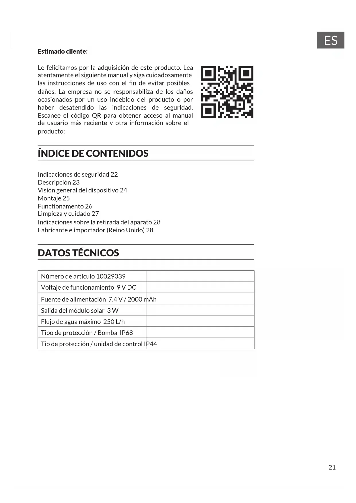 Indicaciones de seguridad 22 Descripción 23 Visión general del dispositivo 24 Montaje 25 Functionamento 26 Limpieza y cuidado 27 Indicaciones sobre la retirada del aparato 28 Fabricante e importador (Reino Unido) 28