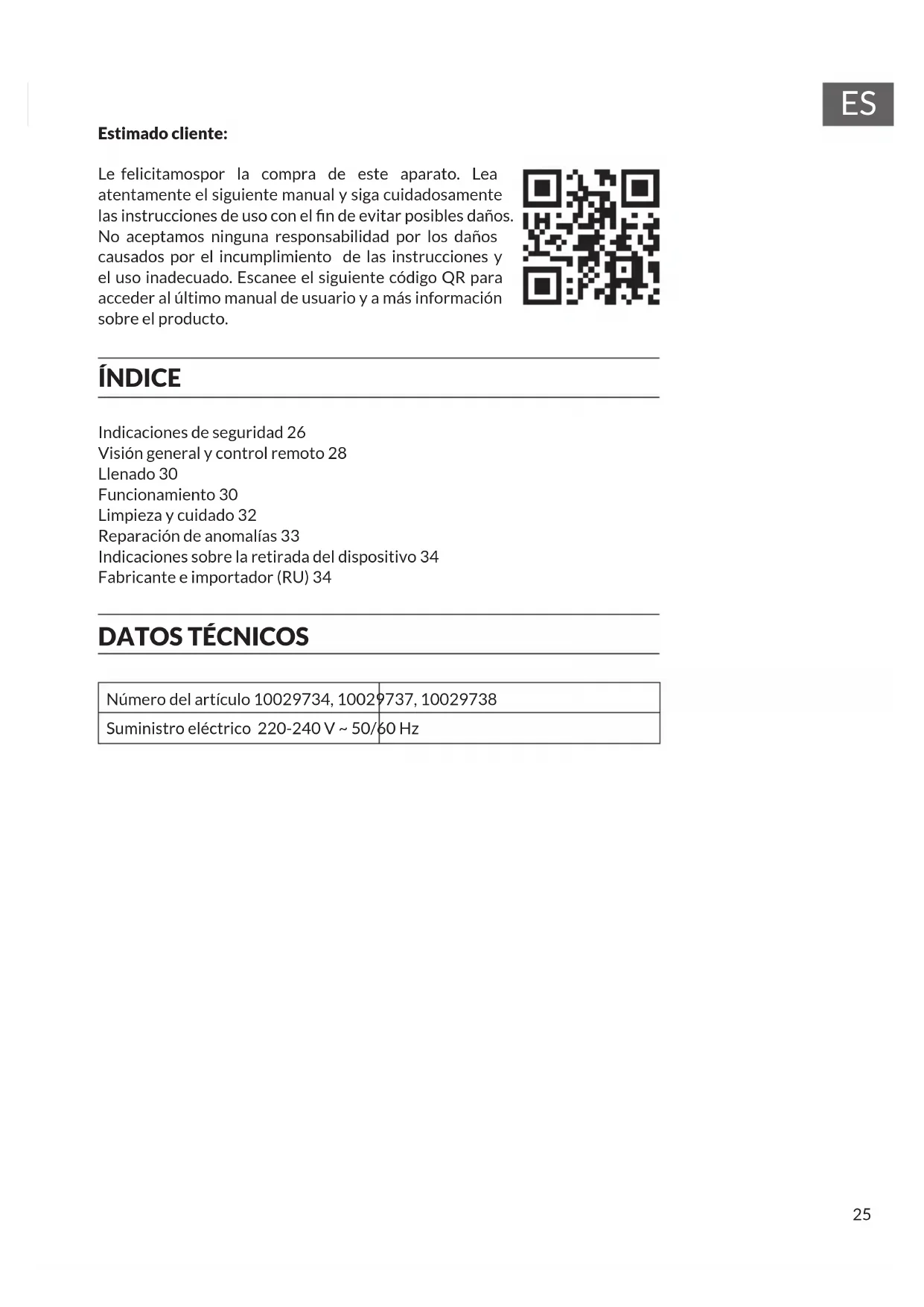 Estimado cliente: Le felicitamospor la compra de este aparato. Lea atentamente el siguiente manual y siga cuidadosamente las instrucciones de uso con el n de evitar posibles daños. No aceptamos ninguna responsabilidad por los daños causados por el incumplimiento de las instrucciones y el uso inadecuado. Escanee el siguiente código QR para acceder al último manual de usuario y a más información sobre el producto. ÍNDICE Indicaciones de seguridad 26 Visión general y control remoto 28 Llenado 30 Funcionamiento 30 Limpieza y cuidado 32 Reparación de anomalías 33 Indicaciones sobre la retirada del dispositivo 34 Fabricante e importador (RU) 34