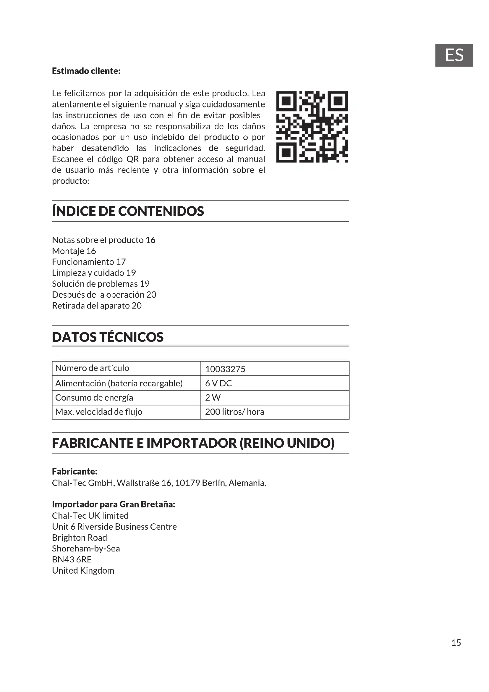 Estimado cliente: Le felicitamos por la adquisición de este producto. Lea atentamente el siguiente manual y siga cuidadosamente las instrucciones de uso con el n de evitar posibles daños. La empresa no se responsabiliza de los daños ocasionados por un uso indebido del producto o por haber desatendido las indicaciones de seguridad. Escanee el código QR para obtener acceso al manual de usuario más reciente y otra información sobre el producto: