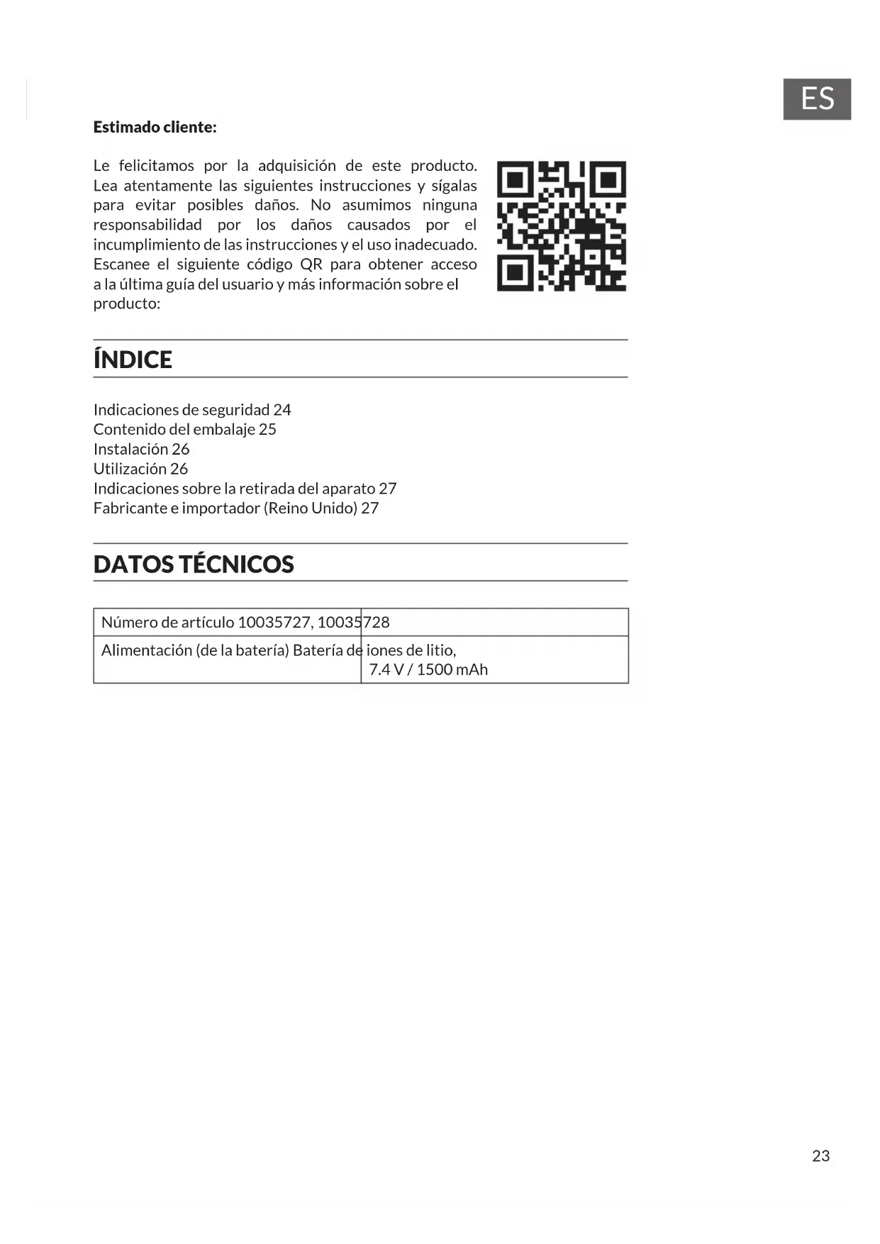 Estimado cliente: Le felicitamos por la adquisición de este producto. Lea atentamente las siguientes instrucciones y sígalas para evitar posibles daños. No asumimos ninguna responsabilidad por los daños causados por el incumplimiento de las instrucciones y el uso inadecuado. Escanee el siguiente código QR para obtener acceso a la última guía del usuario y más información sobre el producto: ÍNDICE Indicaciones de seguridad 24 Contenido del embalaje 25 Instalación 26 Utilización 26 Indicaciones sobre la retirada del aparato 27 Fabricante e importador (Reino Unido) 27
