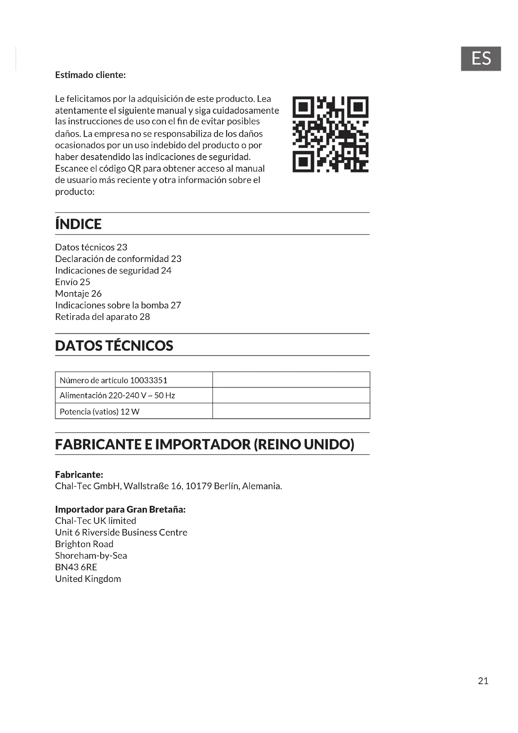 Datos técnicos 23 Declaración de conformidad 23 Indicaciones de seguridad 24 Envío 25 Montaje 26 Indicaciones sobre la bomba 27 Retirada del aparato 28 Esmado cliente: Le felicitamos por la adquisición de este producto. Lea atentamente el siguiente manual y siga cuidadosamente las instrucciones de uso con el n de evitar posibles daños. La empresa no se responsabiliza de los daños ocasionados por un uso indebido del producto o por haber desatendido las indicaciones de seguridad. Escanee el código QR para obtener acceso al manual de usuario más reciente y otra información sobre el producto: ÍNDICE