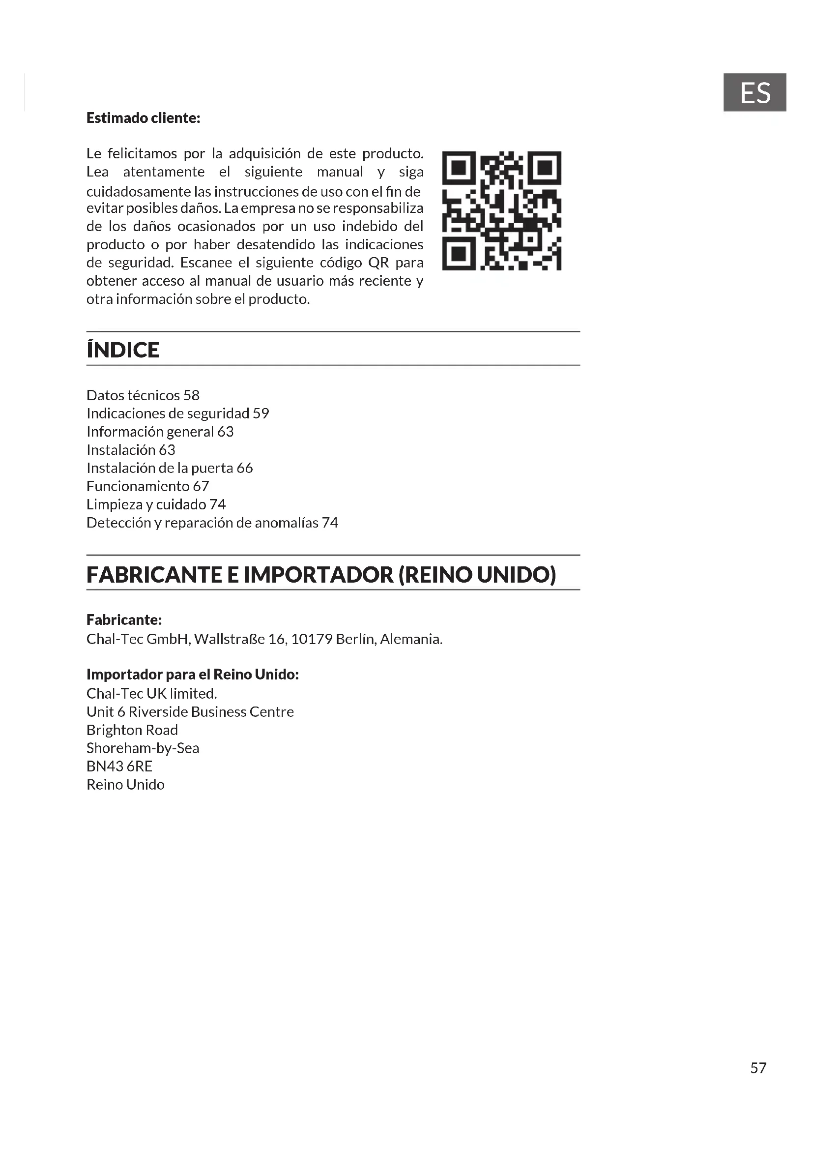 Estimado cliente: Le felicitamos por la adquisición de este producto. Lea atentamente el siguiente manual y siga cuidadosamente las instrucciones de uso con el n de evitar posibles daños. La empresa no se responsabiliza de los daños ocasionados por un uso indebido del producto o por haber desatendido las indicaciones de seguridad. Escanee el siguiente código QR para obtener acceso al manual de usuario más reciente y otra información sobre el producto. ÍNDICE Datos técnicos 58 Indicaciones de seguridad 59 Información general 63 Instalación 63 Instalación de la puerta 66 Funcionamiento 67 Limpieza y cuidado 74 Detección y reparación de anomalías 74 FABRICANTE E IMPORTADOR (REINO UNIDO) Fabricante: Chal-Tec GmbH, Wallstraße 16, 10179 Berlín, Alemania. Importador para el Reino Unido: Chal-Tec UK limited. Unit 6 Riverside Business Centre Brighton Road Shoreham-by-Sea BN43 6RE Reino Unido58