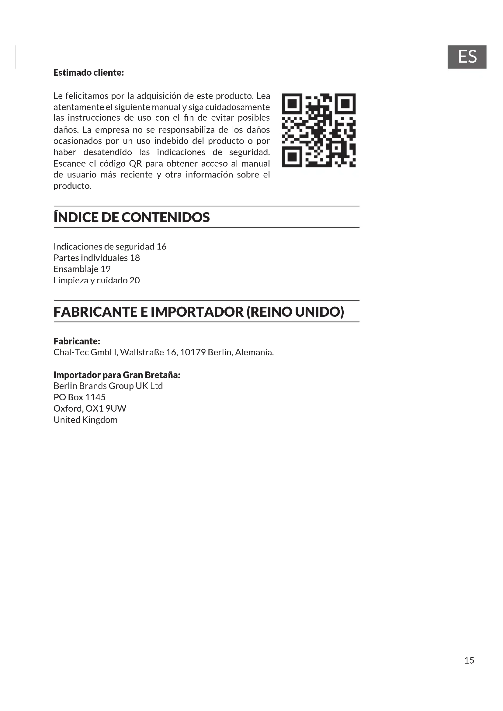 Indicaciones de seguridad 16 Partes individuales 18 Ensamblaje 19 Limpieza y cuidado 20 FABRICANTE E IMPORTADOR (REINO UNIDO) Fabricante: Chal-Tec GmbH, Wallstraße 16, 10179 Berlín, Alemania. Importador para Gran Bretaña: Berlin Brands Group UK Ltd PO Box 1145 Oxford, OX1 9UW United Kingdom16