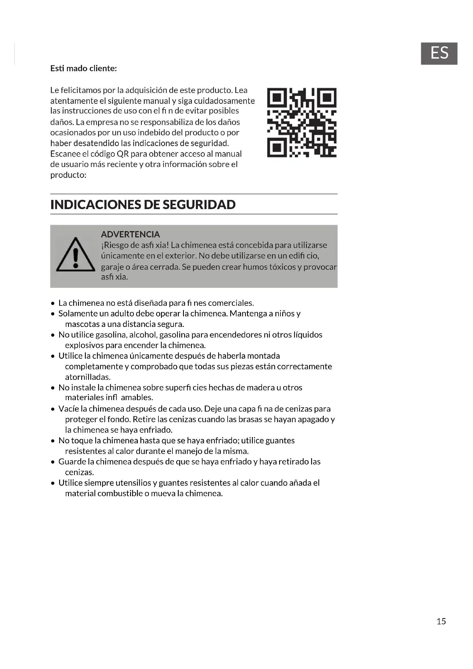 ADVERTENCIA ¡Riesgo de as xia! La chimenea está concebida para utilizarse únicamente en el exterior. No debe utilizarse en un edi cio, garaje o área cerrada. Se pueden crear humos tóxicos y provocar as xia.