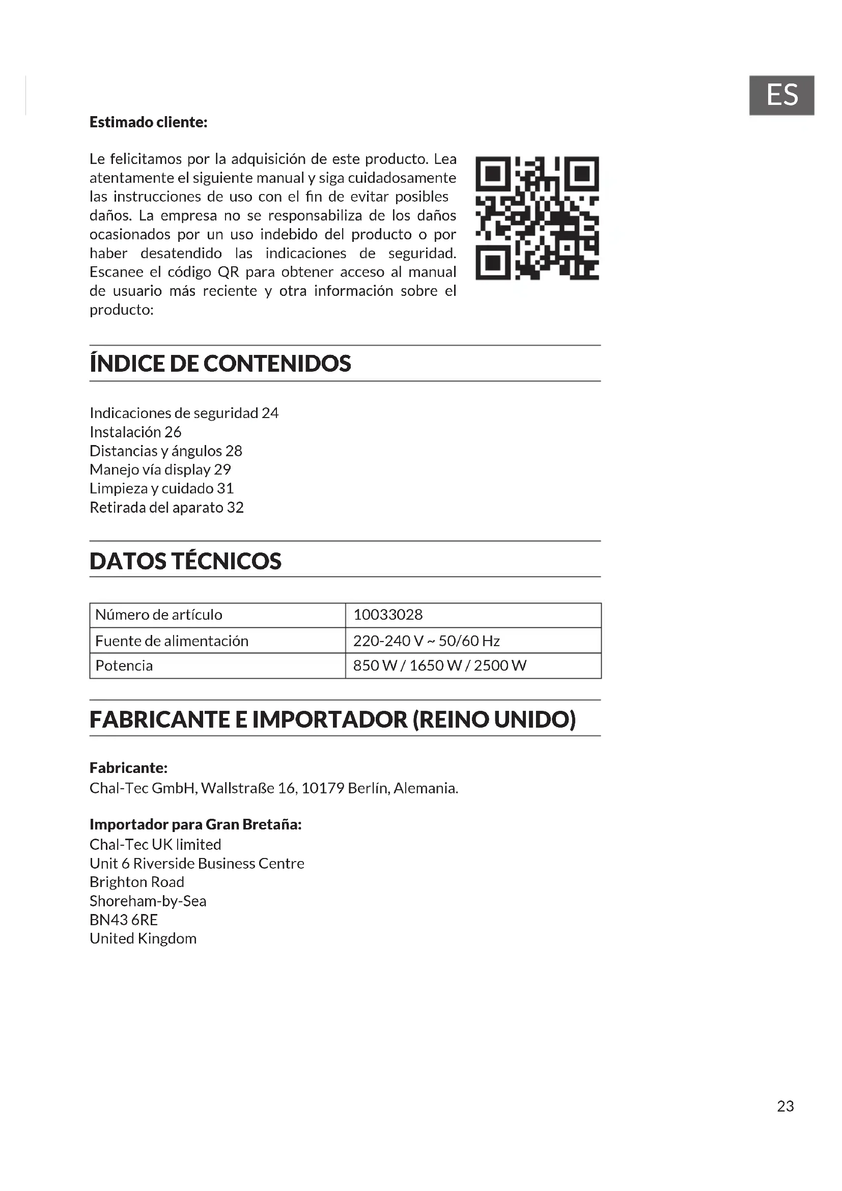 Estimado cliente: Le felicitamos por la adquisición de este producto. Lea atentamente el siguiente manual y siga cuidadosamente las instrucciones de uso con el n de evitar posibles daños. La empresa no se responsabiliza de los daños ocasionados por un uso indebido del producto o por haber desatendido las indicaciones de seguridad. Escanee el código QR para obtener acceso al manual de usuario más reciente y otra información sobre el producto:
