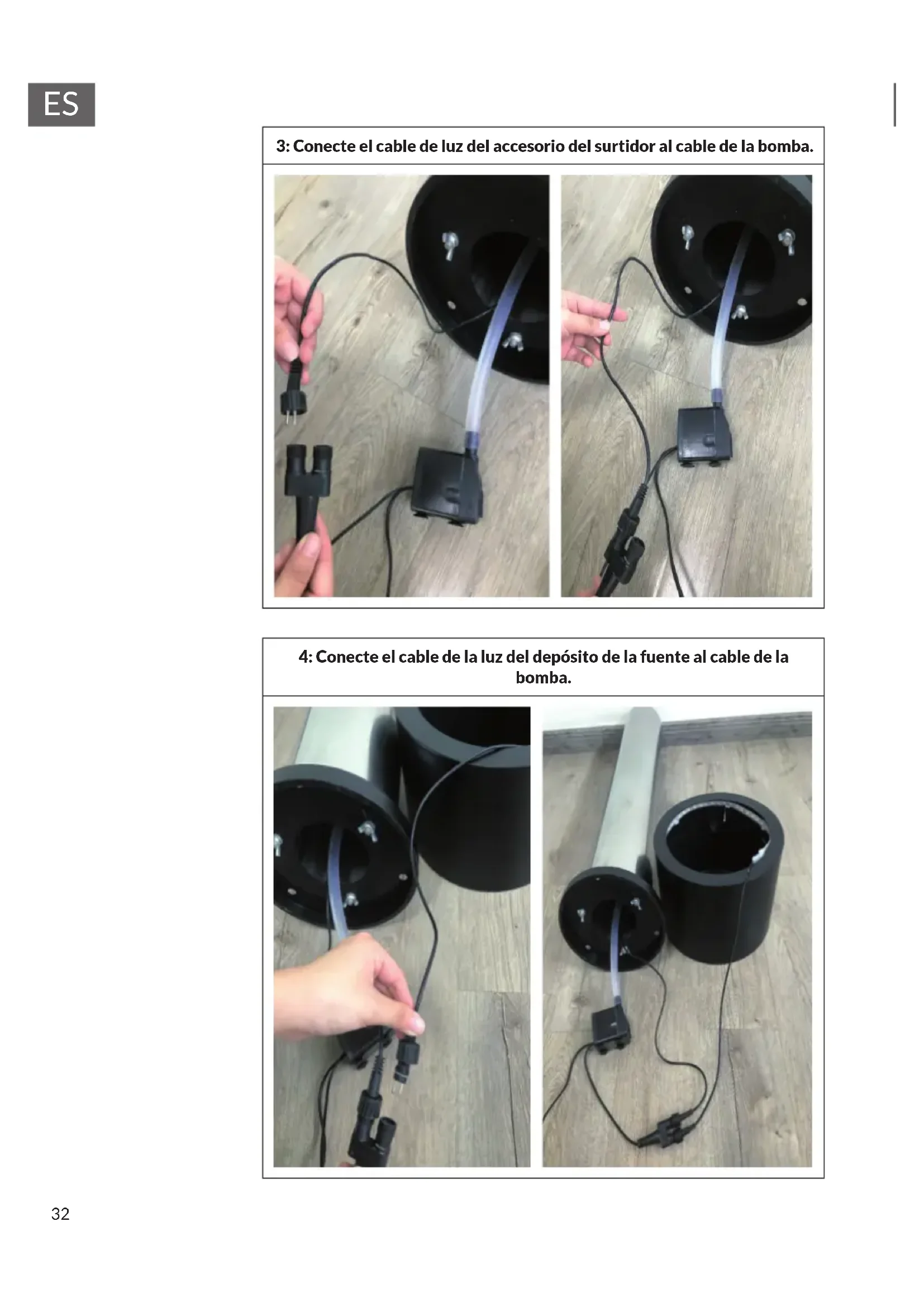 3: Conecte el cable de luz del accesorio del surtidor al cable de la bomba. 4: Conecte el cable de la luz del depósito de la fuente al cable de la bomba.33