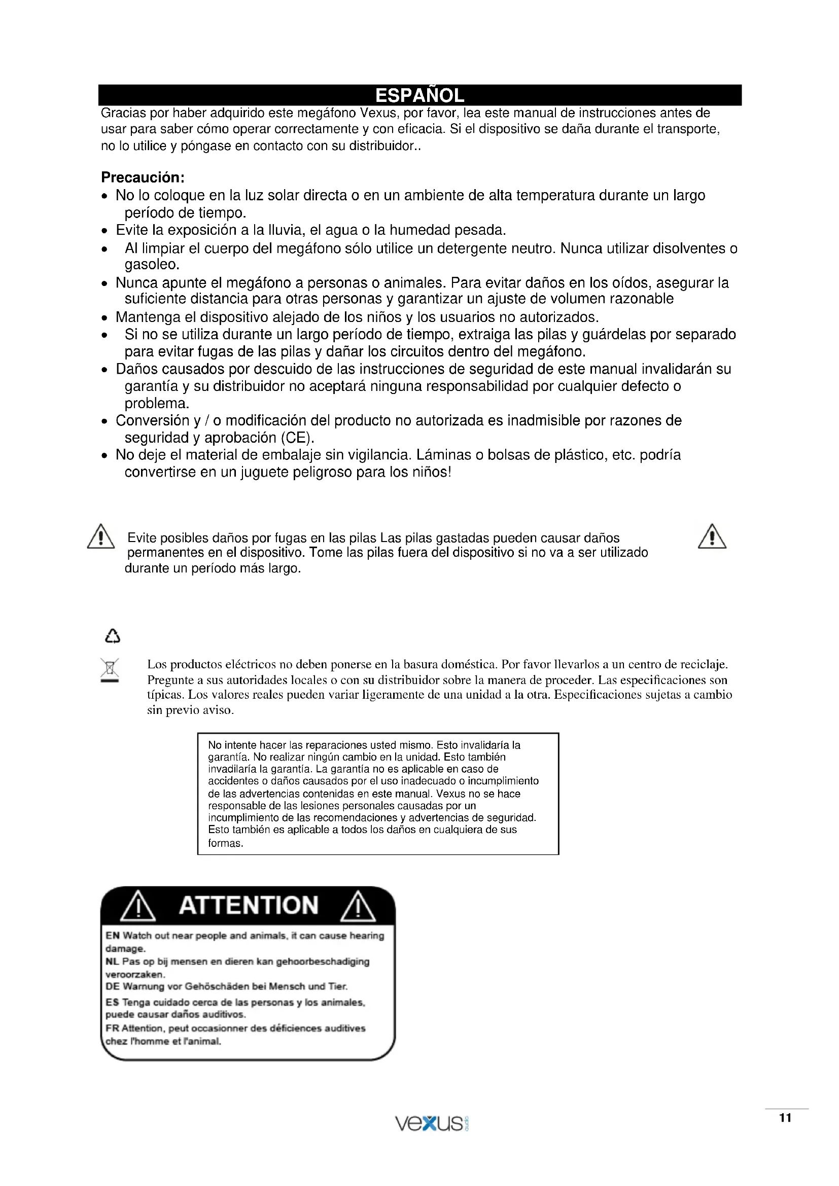 Batterien wahrscheinlich aufgebraucht. Folgen Sie Schritt 1, um neue Batterien einzulegen. USB port/SD Slot in :10 FEHLERDIAGNOSE Wenn das Megaphon nicht richtig funktioniert, entfernen Sie die Batterien und prüfen Sie, ob sie polungsrichtig eingelegt sind. Wenn die Batterien polungsrichtig im Batteriefach liegen, drücken Sie sie fest ein und vergewissern Sie sich, dass die Batterien guten Kontakt haben. TECHNISCHE DATEN Max Ausgangsleistung. : 55Watt Reichweite : auβenbereich ca. 700-1000m Versorgung : 8x C-Batterien Betriebsstunden : ca. 5 stunden Abmessungen : Horn Ø230mm, Lengte 340mm Gewicht (ohne batterien) : 1,3Kg Die Angaben und Daten können ohne vorherige Ankündigung ändern.11 ESPAÑOL Gracias por haber adquirido este megáfono Vexus, por favor, lea este manual de instrucciones antes de usar para saber cómo operar correctamente y con eficacia. Si el dispositivo se daña durante el transporte, no lo utilice y póngase en contacto con su distribuidor.. Precaución: No lo coloque en la luz solar directa o en un ambiente de alta temperatura durante un largo período de tiempo. Evite la exposición a la lluvia, el agua o la humedad pesada. Al limpiar el cuerpo del megáfono sólo utilice un detergente neutro. Nunca utilizar disolventes o gasoleo. Nunca apunte el megáfono a personas o animales. Para evitar daños en los oídos, asegurar la suficiente distancia para otras personas y garantizar un ajuste de volumen razonable Mantenga el dispositivo alejado de los niños y los usuarios no autorizados. Si no se utiliza durante un largo período de tiempo, extraiga las pilas y guárdelas por separado para evitar fugas de las pilas y dañar los circuitos dentro del megáfono. Daños causados por descuido de las instrucciones de seguridad de este manual invalidarán su garantía y su distribuidor no aceptará ninguna responsabilidad por cualquier defecto o problema. Conversión y / o modificación del producto no autorizada es inadmisible por razones de seguridad y aprobación (CE). No deje el material de embalaje sin vigilancia. Láminas o bolsas de plástico, etc. podría convertirse en un juguete peligroso para los niños!