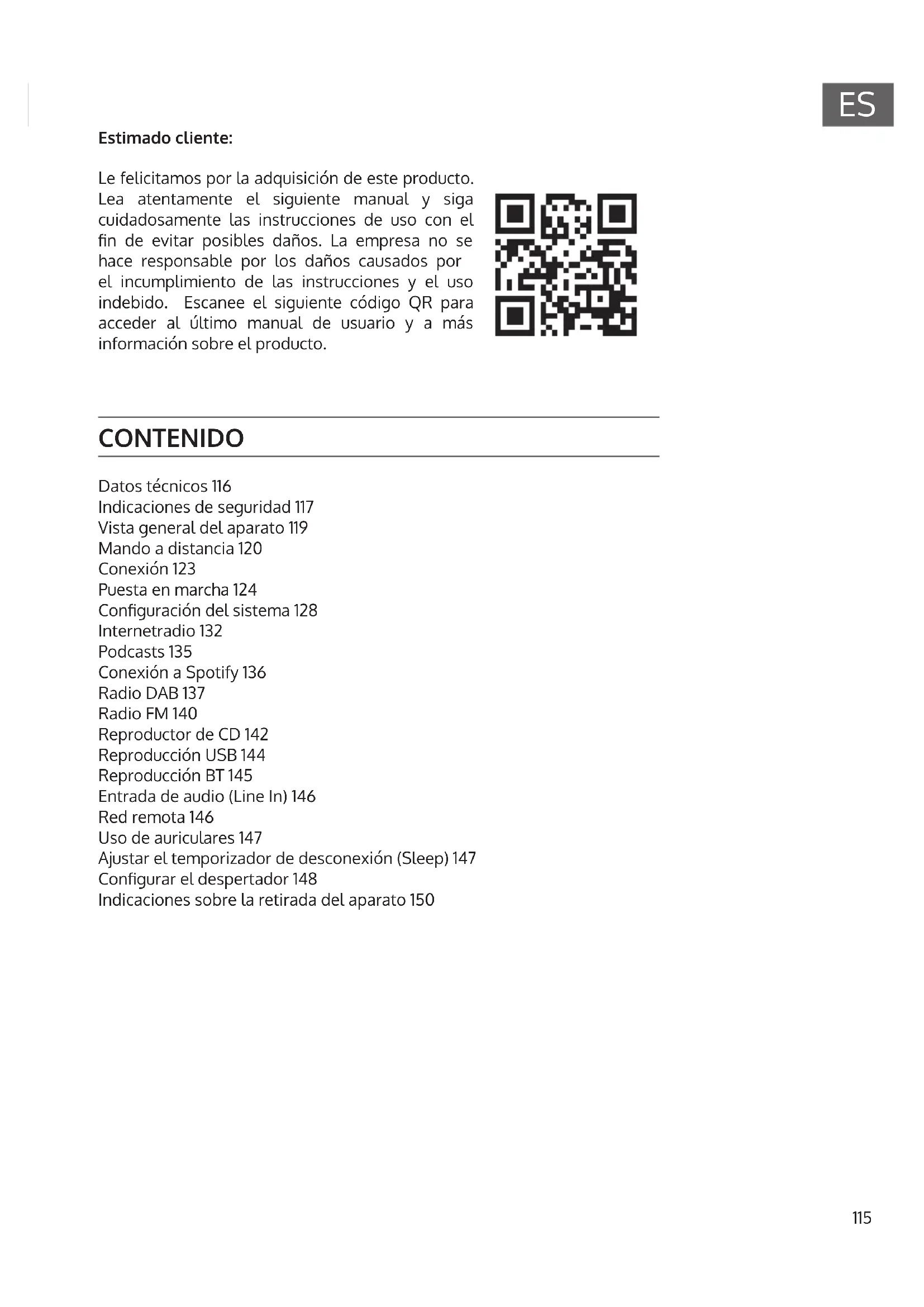 Datos técnicos 116 Indicaciones de seguridad 117 Vista general del aparato 119 Mando a distancia 120 Conexión 123 Puesta en marcha 124 Conguración del sistema 128 Internetradio 132 Podcasts 135 Conexión a Spotify 136 Radio DAB 137 Radio FM 140 Reproductor de CD 142 Reproducción USB 144 Reproducción BT 145 Entrada de audio (Line In) 146 Red remota 146 Uso de auriculares 147 Ajustar el temporizador de desconexión (Sleep) 147 Congurar el despertador 148 Indicaciones sobre la retirada del aparato 150 CONTENIDO Estimado cliente: Le felicitamos por la adquisición de este producto. Lea atentamente el siguiente manual y siga cuidadosamente las instrucciones de uso con el n de evitar posibles daños. La empresa no se hace responsable por los daños causados por el incumplimiento de las instrucciones y el uso indebido. Escanee el siguiente código QR para acceder al último manual de usuario y a más información sobre el producto.116