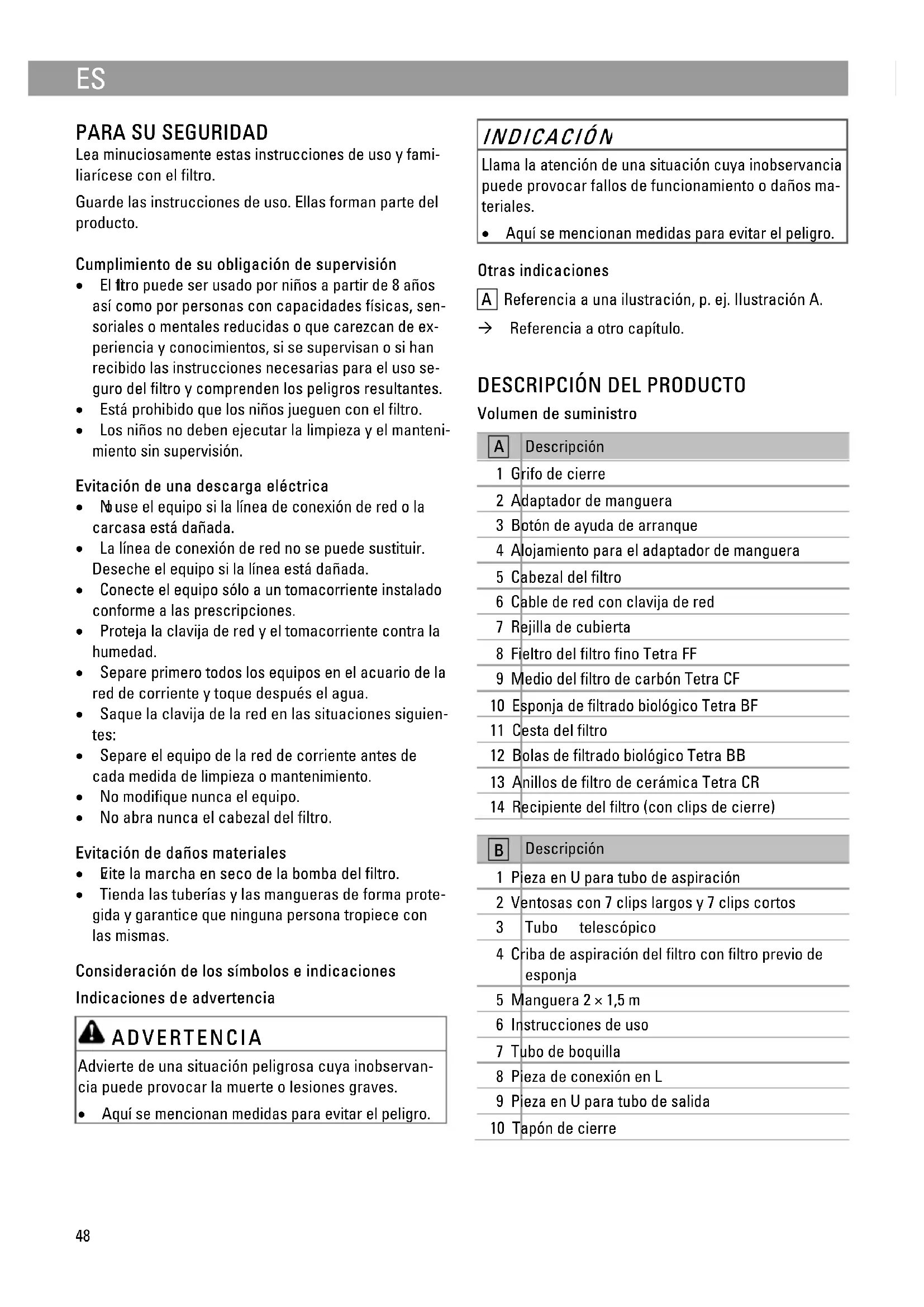 Lea minuciosamente estas instrucciones de uso y fami- liarícese con el filtro. Guarde las instrucciones de uso. Ellas forman parte del producto. Cumplimiento de su obligación de supervisión El fi ltro puede ser usado por niños a partir de 8 años así como por personas con capacidades físicas, sen- soriales o mentales reducidas o que carezcan de ex- periencia y conocimientos, si se supervisan o si han recibido las instrucciones necesarias para el uso se- guro del filtro y comprenden los peligros resultantes. Está prohibido que los niños jueguen con el filtro. Los niños no deben ejecutar la limpieza y el manteni- miento sin supervisión. Evitación de una descarga eléctrica