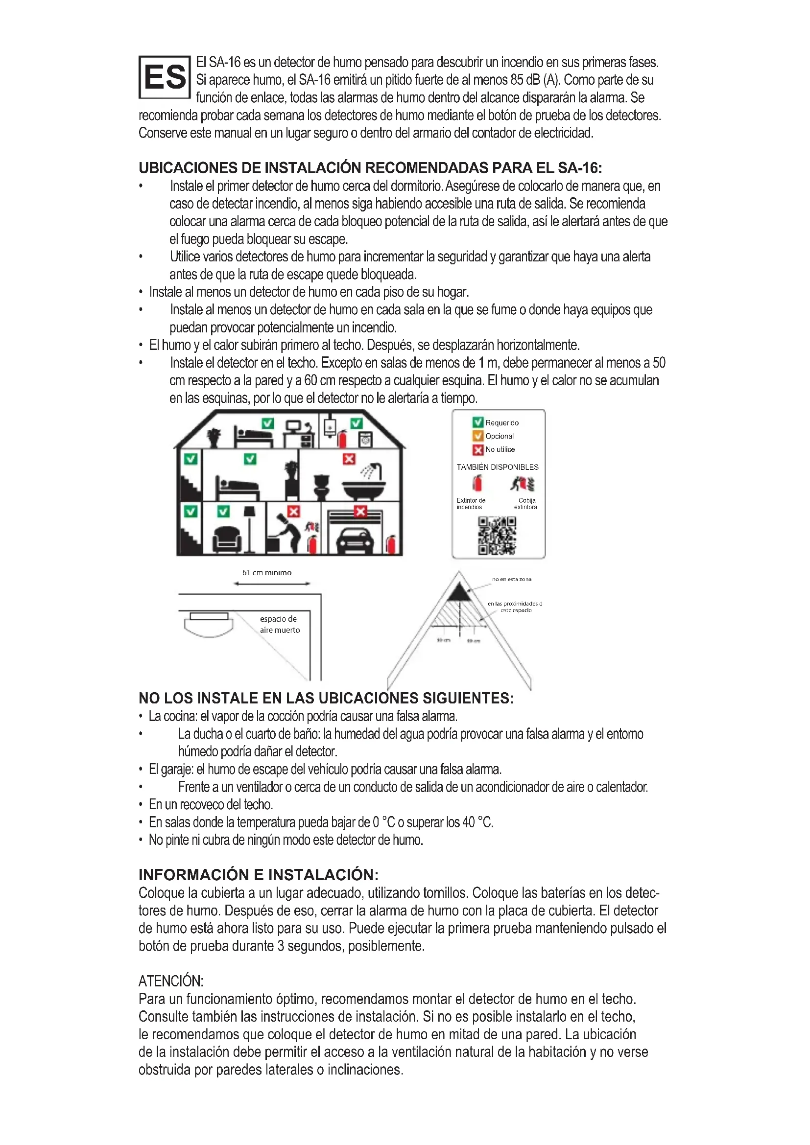 no en esta zona en las proximidades de este espacio Pas de cette salle 61 cm mínimo espacio de aire muerto ROOKMELDERS Extintor de incendiosCobija extintora Requerido Opcional No utilice TAMBIÉN DISPONIBLESUSO , PRUEBAS Y MANTENIMIENTO: Uso: El detector de humo entra en funcionamiento tan pronto como tengamos colocada la pila de 9 voltios. La unidad SA-16 ahora se puede montar en el techo. Sólo cuando pila baterías esta colo- cada, la unidad SA-16 se puede montar en la placa de cubierta. La lámpara LED (bajo el botón de prueba) se enciende aproximadamente cada 30 segundos. Una vez que el humo entre en contacto con el detector de humo la alarma se activa inmediatamente. Una vez que el humo o los gases desaparecen, la alarma se apagará automáticamente por sí misma. Función de prueba: Al pulsar el botón «TEST» 1 vez, puede probar la función de alarma del SA-16. Mantenga pulsado el botón «TEST» durante un mínimo de 3 segundos. Si el detector de humo emite inmediatamente 2 o 3 señales de alarma acústicas la alarma funciona correctamente. Inspec- cione semanalmente el detector de humo. En estado de alarma, el detector de humo generará sonidos de al menos 85 dB (A). No pruebe el detector de humo con velas, llamas abiertas, cigarrillos o similares. Función de desconexión: La función de desconexión permite reducir preventivamente la sensibilidad del detector de humo. Al pulsar el botón «TEST» 2 - 3 sec sin una alarma activa, se reduce la sensibilidad de los detectores de humo durante 9 minutos. El led rojo parpadea 1 vez cada 9 segundos durante el modo silenciado. After 9 minutes the smoke detector resets to its default sensitivity. Puede utilizar este modo cuando sabe que en una situación (por ejemplo, mientras cocina) producirá humo y no existe ningún peligro. Función de silenciar: La función de silenciar permite al usuario reducir la sensibilidad de los detectores de humo du- rante una alarma. Al pulsar el botón «TEST» 3 sec el detector de humo reduce su sensibilidad durante un periodo de 9 minutos. El led rojo parpadea 1 vez cada 9 segundos en modo silen- ciado. Al cabo de 9 minutos el detector de humo restablece su sensibilidad predeterminada. Por ejemplo, se puede usar cuando el detector de humo emite una alarma mientras cocina. ATENCIÓN: