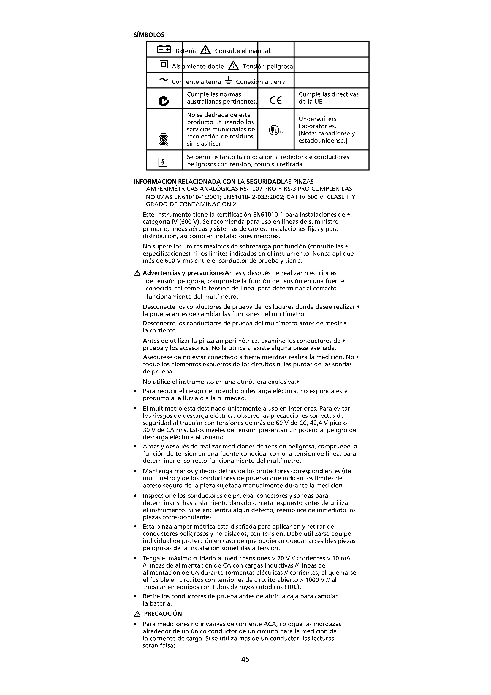 ESPECIFICACIONESGENERALES Pantalla: Escalas analógicas con sujeción para la aguja Alimentación: Voltios / amperios: alimentado por el circuito a prueba Ohmios: Batería AAA de 1,5 V (ANSI/NEDA-24A, IEC LR03) Batería con poca carga: Por debajo de unos 1,2 V Entorno: Funcionamiento en interiores; por debajo de 2000 m (6562 pies) Temperatura de funcionamiento: -15 °C a 50 °C (5 °F a 122 °F) ; < 80 % Temperatura de almacenamiento: -20 ºC a 60 ºC (-4 ºF a 140 ºF), < 80 % H.R. (sin la batería) Coeficiente de temperatura: nominal 0,15 x (exactitud especificada)/ºC a valores de 0 ºC a 18 ºC o 28 ºC a 40 ºC (32 °F a 64 °F u 82 °F a 104 °F) Dimensión: RS-1007 Pro: 261 x 102 x 41 mm (10,3 x 4,0 x 1,6 pulg.) RS-3 Pro: 243 x 102 x 41 mm (10,3 x 4,0 x 1,6 pulg.) Peso: RS-1007 Pro: 0,474 kg (1,05 lb.) RS-3 Pro: 0,455 kg (1,0 lb.) Apertura de la mordaza y diámetro del conductor: RS-1007 PRO: 47 mm (1,88 pulg.) máx RS-3 PRO: 41 mm (1,64 pulg.) máx LVD de seguridad: cumple las normas EN60101-1:2001; EN61010-2-032 (2002), Categoría IV - 600 voltios CA; grado de contaminación: II; clase 2 EMC: EN 61326-1:2006 Este producto cumple los requisitos de las siguientes directivas de la Comunidad Europea: 2004/108/EC (compatibilidad electromagnética) y 2006/95/EC (voltaje bajo) según enmiendas de 93/68/EEC (marca CE). No obstante, la presencia de impulsos eléctricos o campos electromagnéticos intensos cerca del equipo puede afectar al funcionamiento del circuito de medición. Los instrumentos de medición también responden a señales no deseadas que puedan estar presentes en el circuito de medición. Los usuarios deben obrar con cuidado y tomar las precauciones apropiadas para evitar resultados erróneos al realizar mediciones en presencia de interferencia electrónica.48 Eléctrica 23 ºC ± 5 ºC (73 ºf ± 9 ºf) < 75% H.R. Tensión de CA (50/60 Hz) Rangos: 150 / 300 / 600 Vrms Exactitud: ± 3% de la escala completa Impedancia de entrada: 1,5 MΩ Protección contra sobrecarga: 600 V CA rms Amp de CA (50/60 Hz) Rangos: RS-1007 Pro: 15 / 40 / 100 / 300 / 1000 Arms RS-3 Pro: 6 / 15 / 40 / 100 / 600 Arms Exactitud: ± 3 % de la escala completa Ohmios Rango: 1000 ohmios 25 ohmios a media escala Exactitud: ± 3 grados de arco Voltaje de circuito abierto: 1,5 V Corriente de cortocircuito: 58 mA Protección contra sobrecarga: (Fusible F de 0,5 A / 1000 V, tamaño 6 x 32 mm, IR, quemado rápido, cerámico)49 COM Ve CAT IV 600V