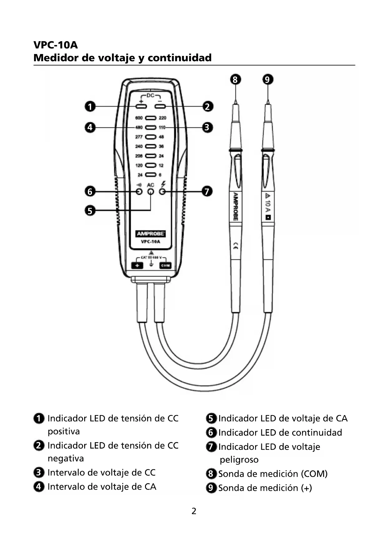 Su caja de embalaje deberá contener: 1 Medidor de voltaje y continuidad VPC-10A 3 Pilas de 1.5V IEC LR03 AAA 1 Manual de usuario Si alguno de los componentes está dañado o no está incluido, devuelva el embalaje completo al lugar donde lo compró para que se lo cambien. CARACTERÍSTICAS El comprobador de tensión y continuidad Amprobe VPC-10A está diseñado para ser resistente y fácil de utilizar para las pruebas de tensión y continuidad. Incluye siete indicadores de voltaje diferentes que indican de manera clara los diferentes niveles de voltaje clave y una alarma que indica la presencia de un voltaje y continuidad peligrosos.
