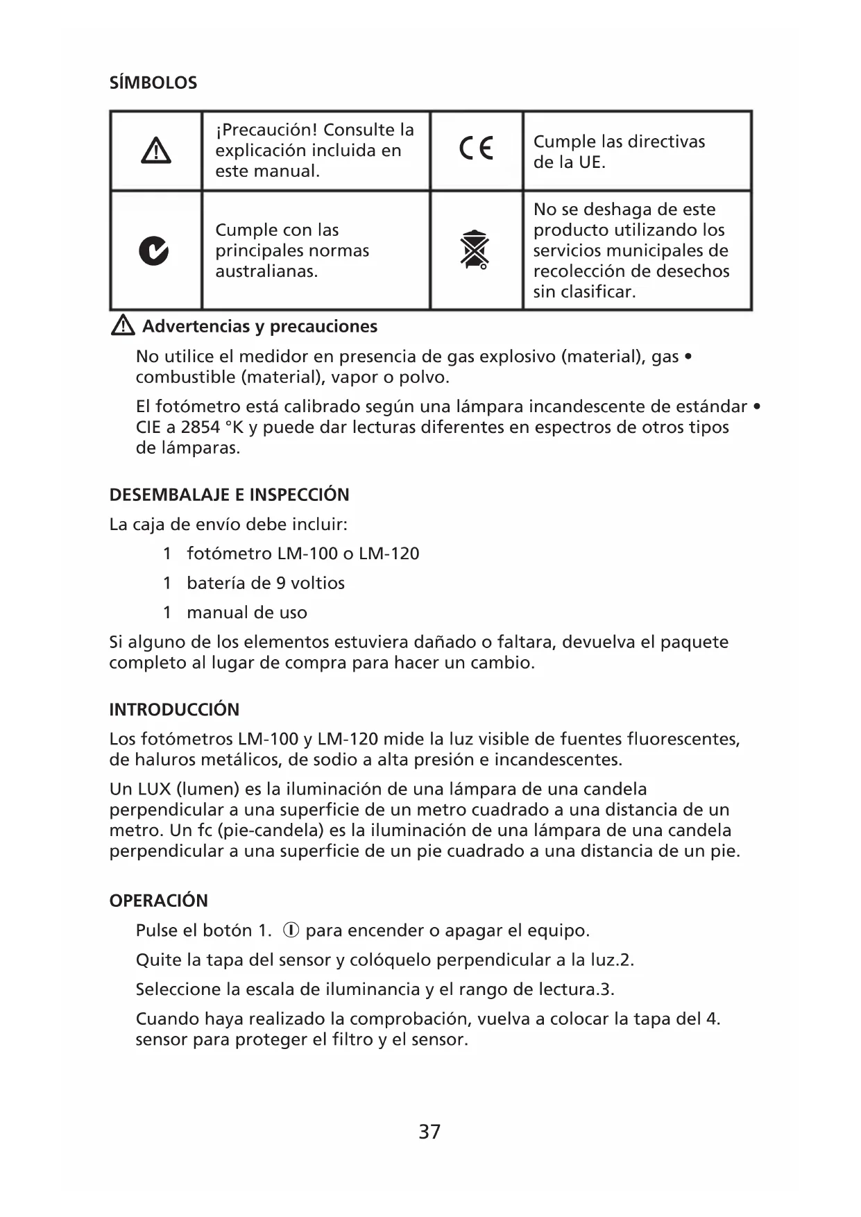 No se deshaga de este producto utilizando los servicios municipales de recolección de desechos sin clasificar. Advertencias y precauciones No utilice el medidor en presencia de gas explosivo (material), gas • combustible (material), vapor o polvo. El fotómetro está calibrado según una lámpara incandescente de estándar • CIE a 2854 °K y puede dar lecturas diferentes en espectros de otros tipos de lámparas.