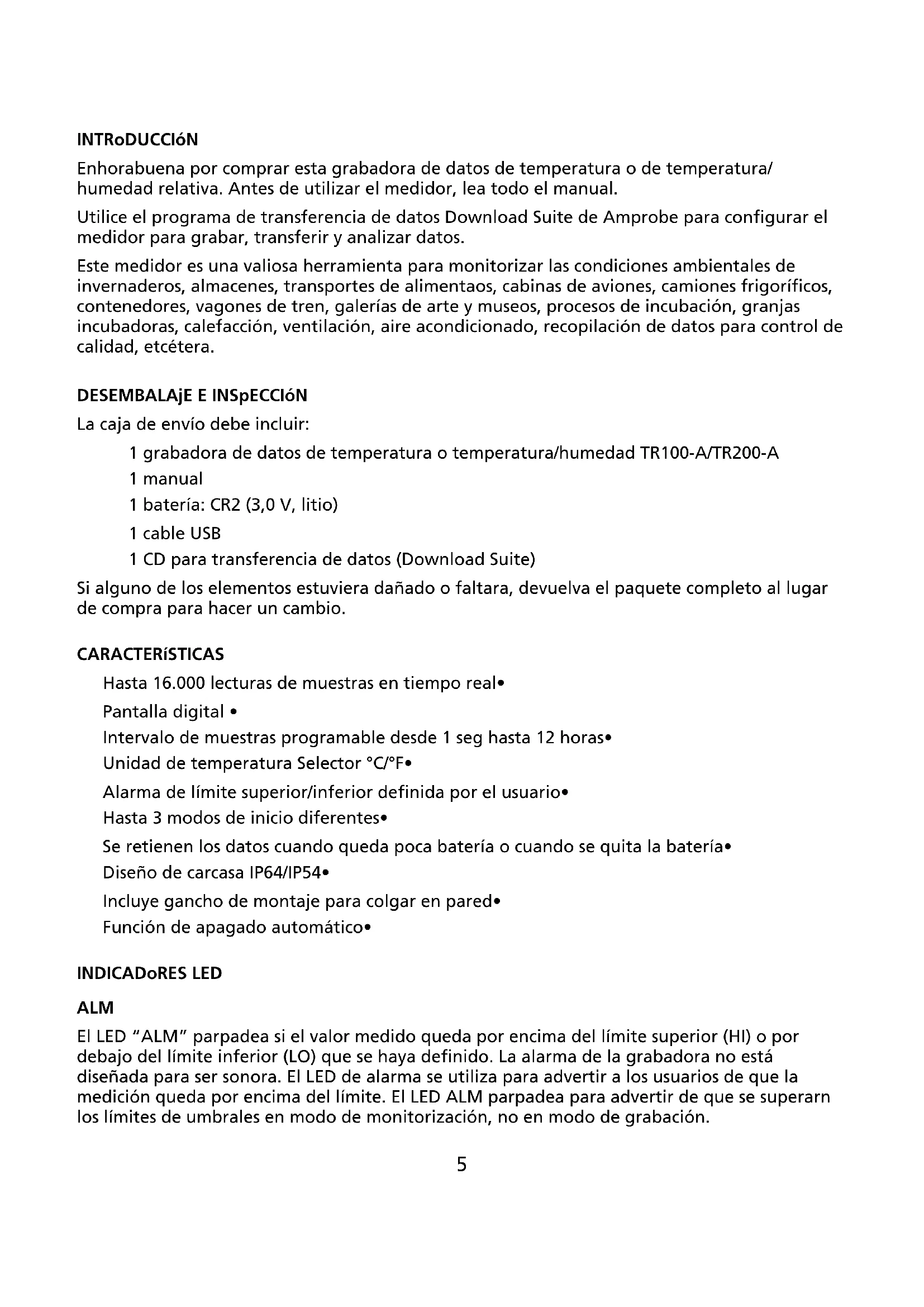 - Códigos de error INTRoDUCCIóN Enhorabuena por comprar esta grabadora de datos de temperatura o de temperatura/ humedad relativa. Antes de utilizar el medidor, lea todo el manual. Utilice el programa de transferencia de datos Download Suite de Amprobe para configurar el medidor para grabar, transferir y analizar datos. Este medidor es una valiosa herramienta para monitorizar las condiciones ambientales de invernaderos, almacenes, transportes de alimentaos, cabinas de aviones, camiones frigoríficos, contenedores, vagones de tren, galerías de arte y museos, procesos de incubación, granjas incubadoras, calefacción, ventilación, aire acondicionado, recopilación de datos para control de calidad, etcétera. DESEMBALAjE E INSpECCIóN La caja de envío debe incluir: 1 grabadora de datos de temperatura o temperatura/humedad TR100-A/TR200-A 1 manual 1 batería: CR2 (3,0 V, litio) 1 cable USB 1 CD para transferencia de datos (Download Suite) Si alguno de los elementos estuviera dañado o faltara, devuelva el paquete completo al lugar de compra para hacer un cambio. CARACTERíSTICAS Hasta 16.000 lecturas de muestras en tiempo real• Pantalla digital • Intervalo de muestras programable desde 1 seg hasta 12 horas• Unidad de temperatura Selector °C/°F• Alarma de límite superior/inferior definida por el usuario• Hasta 3 modos de inicio diferentes• Se retienen los datos cuando queda poca batería o cuando se quita la batería• Diseño de carcasa IP64/IP54• Incluye gancho de montaje para colgar en pared• Función de apagado automático• INDICADoRES LED ALM El LED “ALM” parpadea si el valor medido queda por encima del límite superior (HI) o por debajo del límite inferior (LO) que se haya definido. La alarma de la grabadora no está diseñada para ser sonora. El LED de alarma se utiliza para advertir a los usuarios de que la medición queda por encima del límite. El LED ALM parpadea para advertir de que se superarn los límites de umbrales en modo de monitorización, no en modo de grabación.6 REC Cuando la unidad funciona en modo de grabación, parpadearán los dos LED para indicar que está en modo de grabación. El LED ALM también parpadea, pero no indica si la medición supera los límites establecidos. El análisis de los datos grabados indicará si se han superado los umbrales superior (HI) o inferior (LO).PANTALLA LCD p. 105
