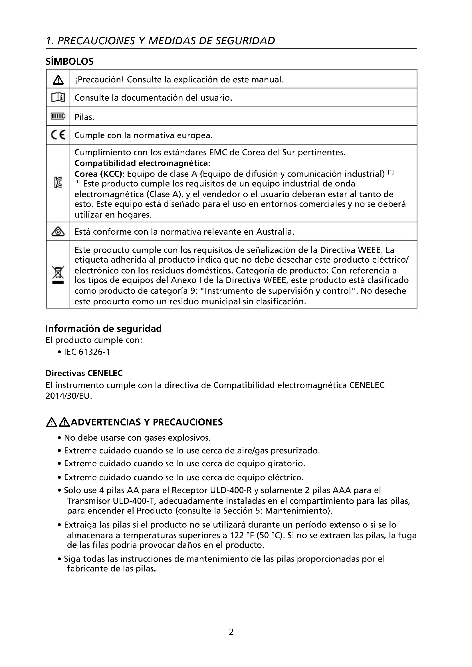 ¡Precaución! Consulte la explicación de este manual. Consulte la documentación del usuario. Pilas. Cumple con la normativa europea. Cumplimiento con los estándares EMC de Corea del Sur pertinentes. Compatibilidad electromagnética: Corea (KCC): Equipo de clase A (Equipo de difusión y comunicación industrial) [1] [1] Este producto cumple los requisitos de un equipo industrial de onda electromagnética (Clase A), y el vendedor o el usuario deberán estar al tanto de esto. Este equipo está diseñado para el uso en entornos comerciales y no se deberá utilizar en hogares. Está conforme con la normativa relevante en Australia. Este producto cumple con los requisitos de señalización de la Directiva WEEE. La etiqueta adherida al producto indica que no debe desechar este producto eléctrico/ electrónico con los residuos domésticos. Categoría de producto: Con referencia a los tipos de equipos del Anexo I de la Directiva WEEE, este producto está clasificado como producto de categoría 9: "Instrumento de supervisión y control". No deseche este producto como un residuo municipal sin clasificación. Información de seguridad El producto cumple con: