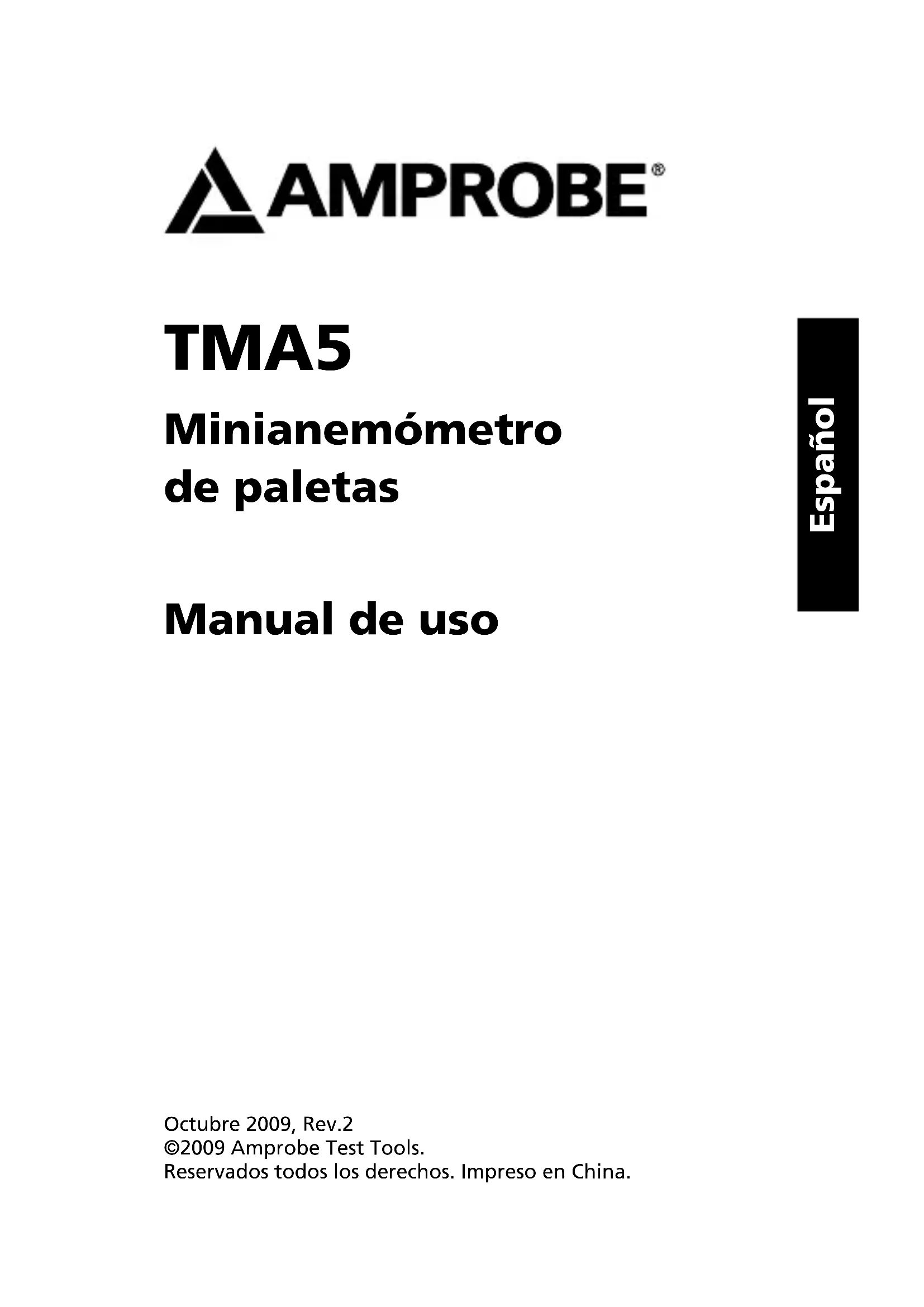 FT/M Fig. 2 Fig. 4 Fig. 3 Fig. 1TMA5 Minianemómetro de paletas Manual de uso Octubre 2009, Rev.2 ©2009 Amprobe Test Tools. Reservados todos los derechos. Impreso en China. EspañolGarantía limitada y limitación de responsabilidad Su producto Amprobe estará libre de defectos de material y mano de obra durante 1 año a partir de la fecha de compra. Esta garantía no cubre fusibles, baterías desechables ni daños que sean consecuencia de accidentes, negligencia, uso indebido, alteración, contaminación o condiciones anormales de uso o manipulación. Los revendedores no están autorizados a extender ninguna otra garantía en nombre de Amprobe. Para obtener servicio durante el período de garantía, devuelva el producto con un comprobante de compra a un centro de servicio autorizado por Amprobe de equipos de comprobación o a un concesionario o distribuidor de Amprobe. Consulte la sección Reparación para obtener información más detallada. ESTA GARANTÍA CONSTITUYE SU ÚNICO RESARCIMIENTO. TODAS LAS DEMÁS GARANTÍAS, TANTO EXPRESAS, IMPLÍCITAS COMO ESTATUTARIAS, INCLUYENDO LAS GARANTÍAS IMPLÍCITAS DE IDONEIDAD PARA UN PROPÓSITO DETERMINADO O COMERCIABILIDAD, QUEDAN POR LA PRESENTE DESCONOCIDAS. EL FABRICANTE NO SERÁ RESPONSABLE DE NINGÚN DAÑO O PÉRDIDA, YA SEA ESPECIAL, INDIRECTO, CONTINGENTE O RESULTANTE QUE SURJA DE CUALQUIER CAUSA O TEORÍA. Debido a que determinados estados o países no permiten la exclusión o limitación de una garantía implícita o de los daños contingentes o resultantes, esta limitación de responsabilidad puede no regir para usted. Reparación Todas las herramientas de prueba devueltas para reparación bajo la garantía o fuera de garantía, o devueltas para calibración, deben ir acompañadas de lo siguiente: su nombre, el nombre de su compañía, la dirección, el número de teléfono y la prueba de compra. Además, incluya una breve descripción del problema o del servicio solicitado y los conductores de prueba del medidor. Los gastos en concepto de reparación o reemplazo fuera de garantía deben remitirse en forma de cheque, giro postal, tarjeta de crédito con fecha de vencimiento o una orden de compra pagadera a Amprobe