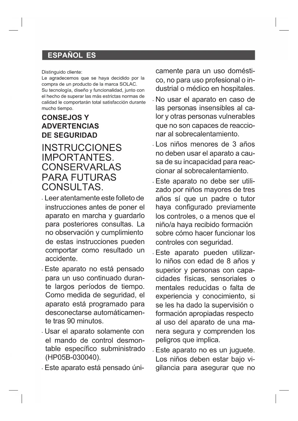 - Este aparato no está pensado para un uso continuado duran- te largos períodos de tiempo. Como medida de seguridad, el aparato está programado para desconectarse automáticamen- te tras 90 minutos.