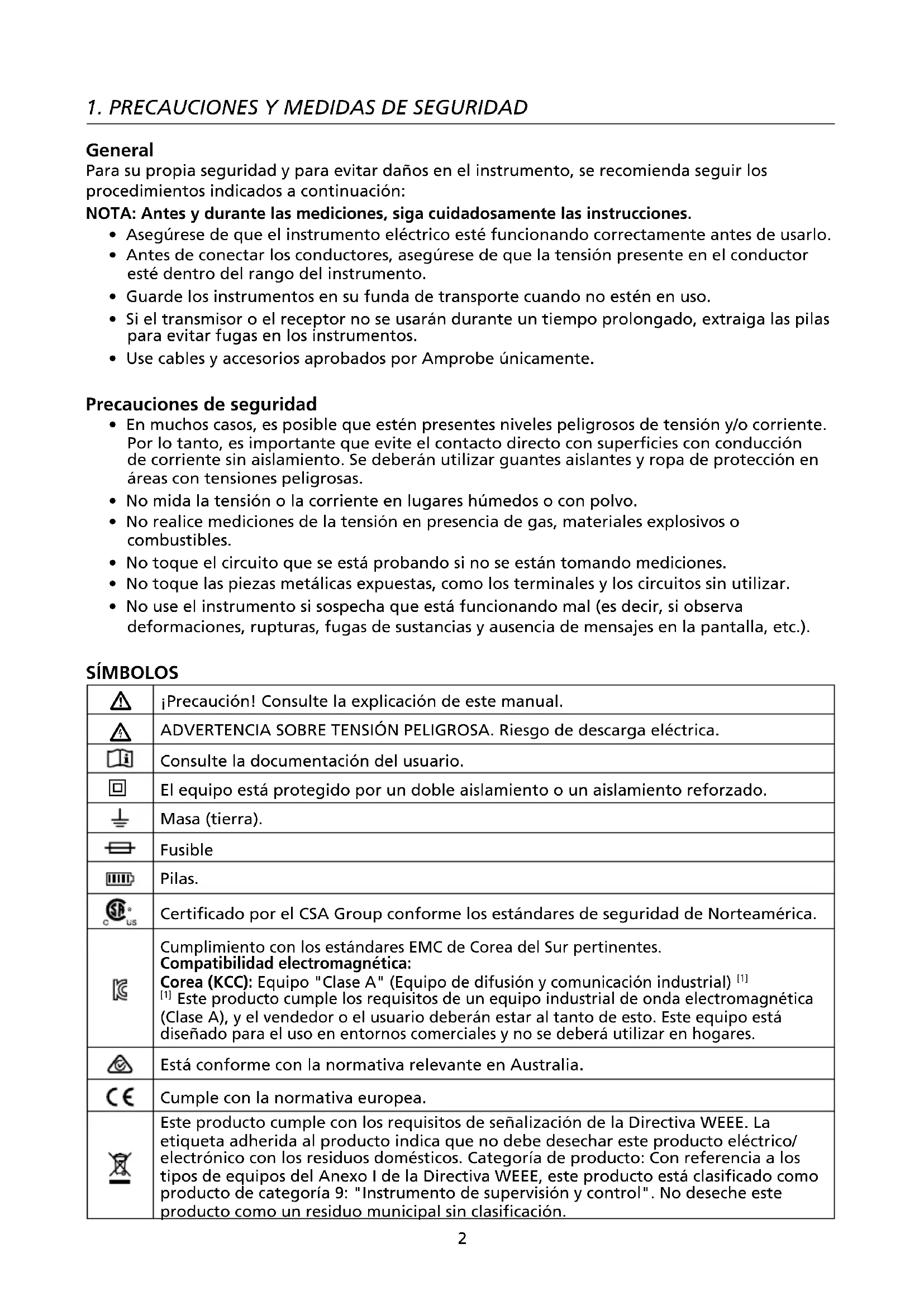 - Use cables y accesorios aprobados por Amprobe únicamente. Precauciones de seguridad