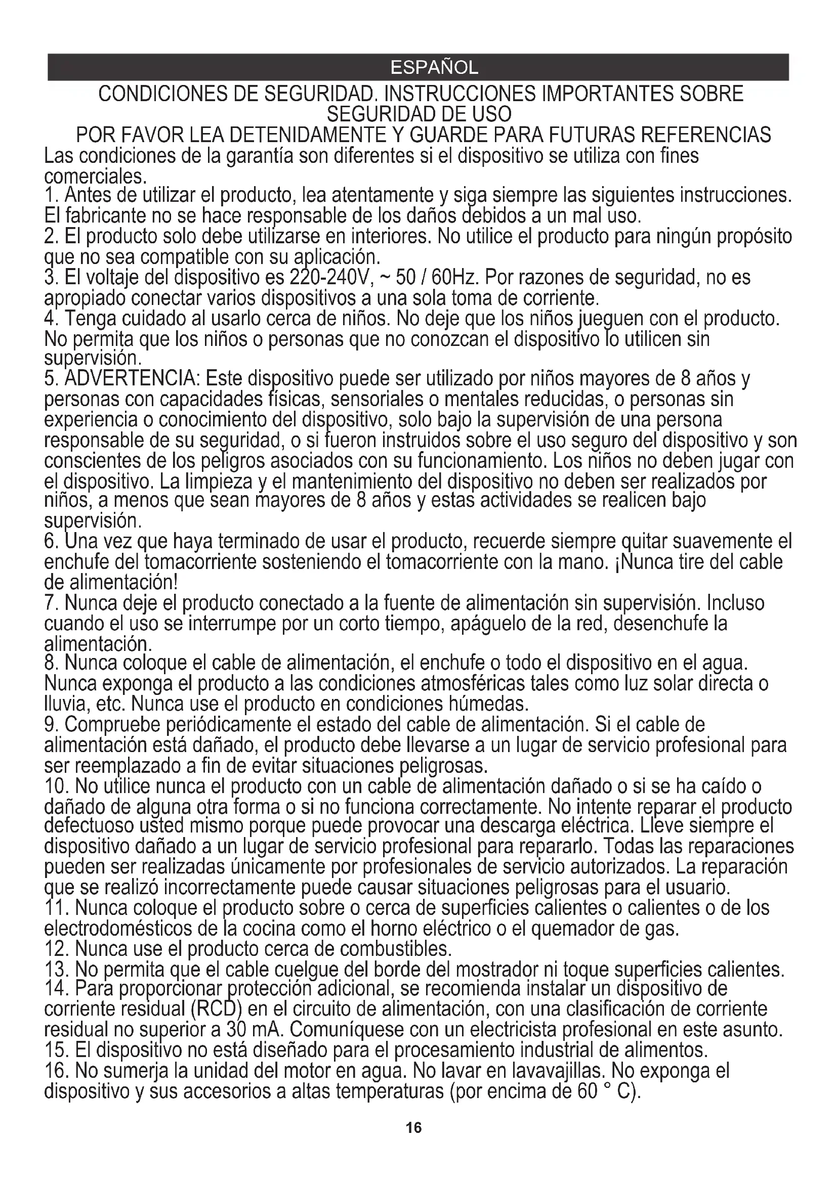 16. No sumerja la unidad del motor en agua. No lavar en lavavajillas. No exponga el