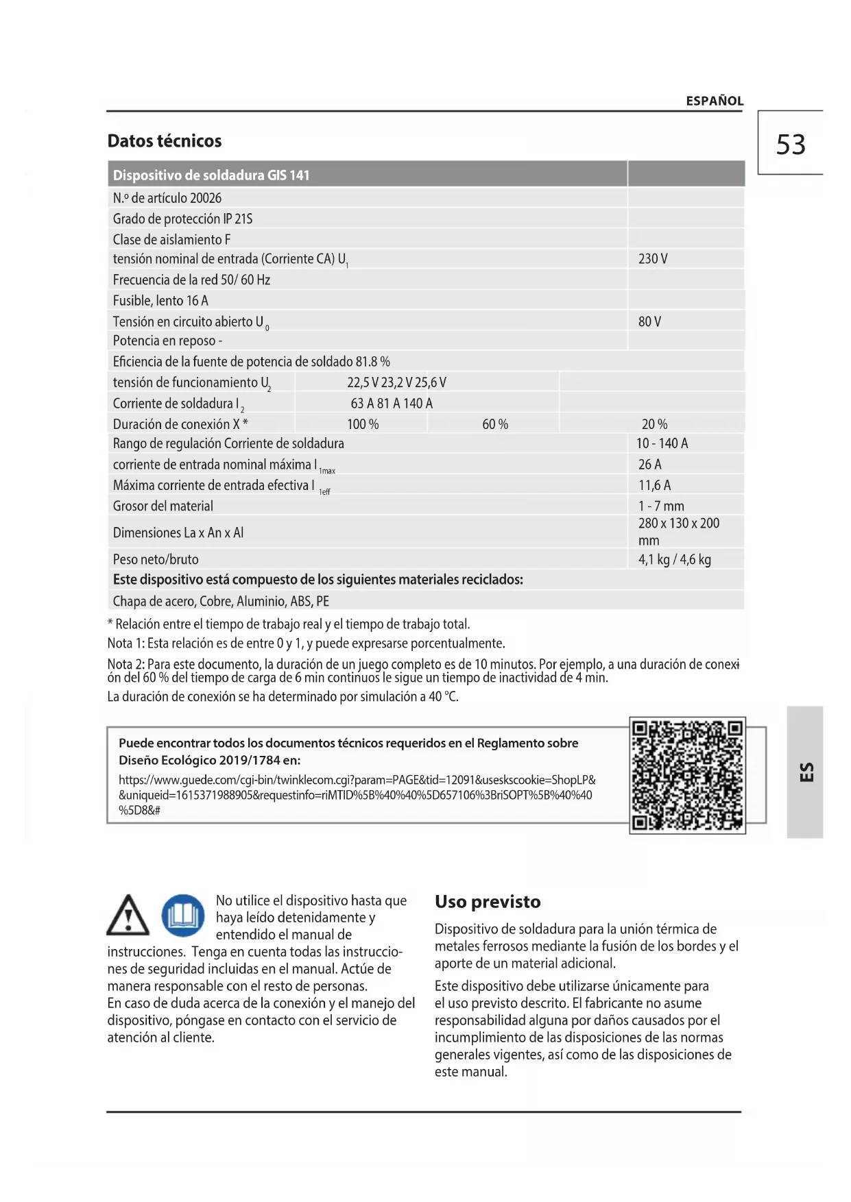 ón del 60% del tiempo de carga de 6 min continuos le sigue un tiempo de inactividad de 4 min. La duración de conexión se ha determinado por simulación a 40°C. Puede encontrar todos los documentos técnicos requeridos en el Reglamento sobre Diseño Ecológico 2019/1784 en: https://www.guede.com/cgi-bin/twinklecom.cgi?param=PAGE&tid=12091&useskscookie=ShopLP& &uniqueid=1615371988905&requestinfo=riMTID%5B%40%40%5D657106%3BriSOPT%5B%40%40 %5D86 Temperatura ambiente -10 °C - +40 °C humedad relativa máx. 50 % (40 °C), 90 % (20 °C) Altitud máx. sobre el nivel del mar 1000 m El aire ambiente debe estar libre de cantidades inusuales de polvo, ácidos y de gases o sustancias corrosivos. Advertimos que nuestro equipo no ha sido diseñado para su uso profesional, artesanal o industrial. Si el equipo se utiliza en establecimientos industriales, profesionales, artesanales o en actividades similares, no podemos asumir la responsabilidad y garantía. Instrucciones de seguridad ¡PELIGRO! ¡Descarga eléctrica! ¡Existe peligro de lesiones por corriente eléctrica! El funcionamiento está permitido exclusivamente con un interruptor diferencial (corriente de fuga máx. del ID 30 mA). La máquina de soldadura presenta el grado de protección IP21 y no debe exponerse a la lluvia ni a la humedad durante el funcionamiento o almacena