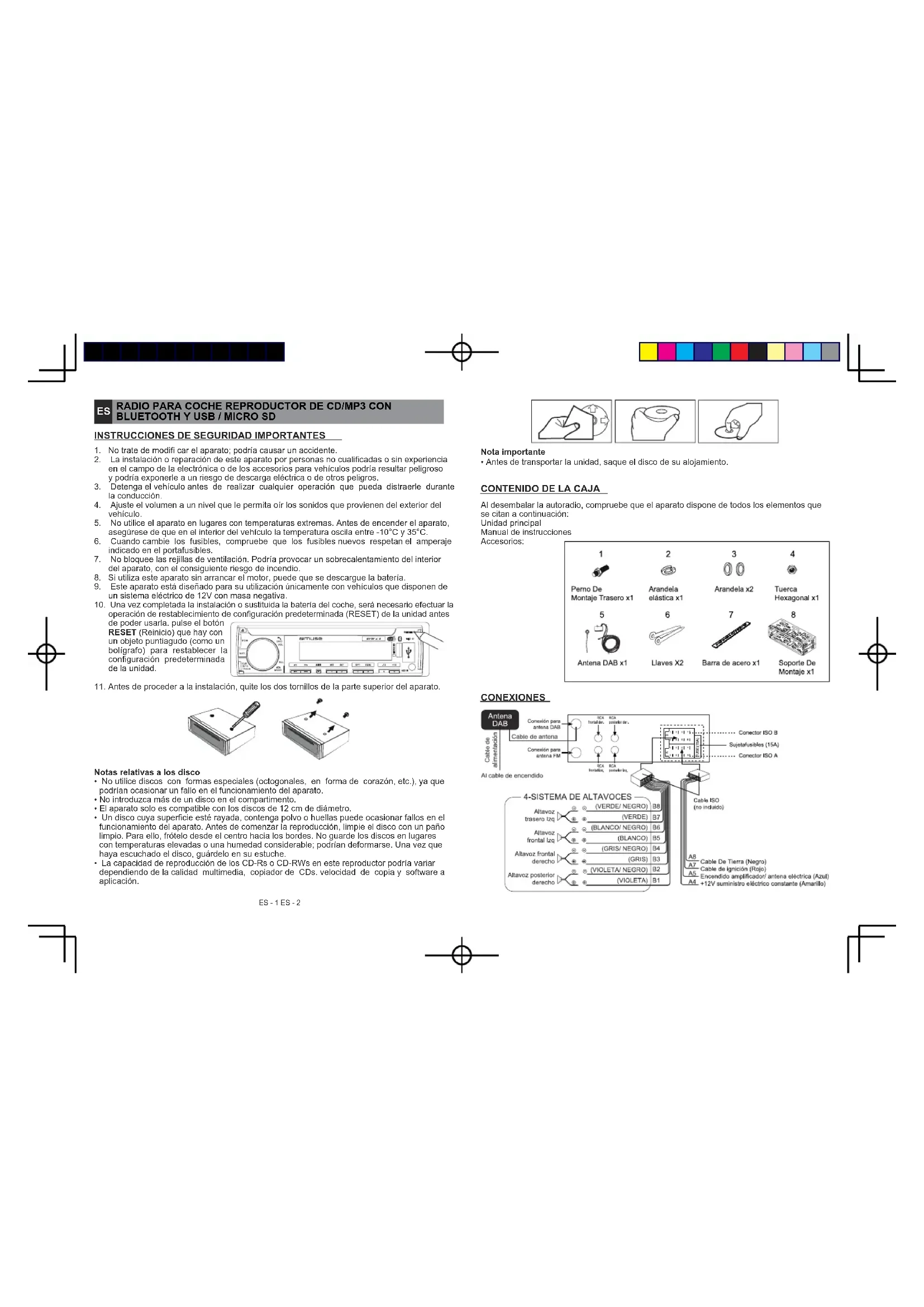 DAB+ Sensibilidad de uso (-30dB) Proporción de señal-ruido Separación estéreo Sección de reproductor CD/USB/MICRO-SD/MP3 Relación señal/ruido Separación Distorsión Respuesta en frecuencia BLUETOOTH Versión Bluetooth: Bluetooth: Salida de corriente RF (radiofrecuencia): 12V DC (11-16V permitidos) 4 ohms 40W x 4 ±10 dB graves a 100 Hz agudos a 10 kHz Approx. 175 x 178 x 50 mm (d / w / h) 87.5-108 (MHz) 174.928-239.2 MHz 12 dBuV 50 dB 30 dB 50 dB 40 dB <0.5%