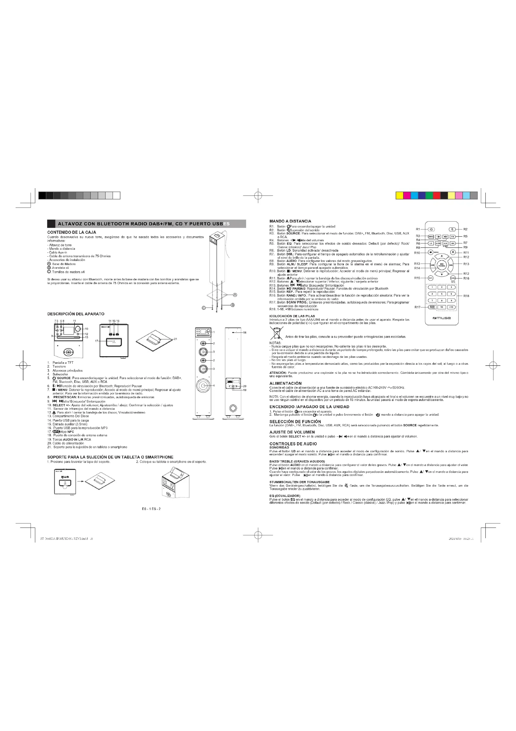 R1. Botón : Para encender/apagar la unidad R2. Botón : Supresión del sonido R3. Botón SOURCE: Para seleccionar el modo de función: DAB+, FM, Bluetooth, Disc, USB, AUX o RCA. R4. Botones / : Ajuste del volumen R5. Botón EQ: Para seleccionar los efectos de sonido deseados: Default (por defecto)/ Rock/ Classic (clásico)/ Jazz/ Pop R6. Botón LD: Sonoridad activada/ desactivada R7. Botón DIM.: Para congurar el tiempo de apagado automático de la retroiluminación y ajustar el nivel de brillo de la pantalla. R8. Botón AUDIO: Para congurar los valores del modo graves/agudos. R9. Botón ALM./ SLEEP: Para congurar la hora de la alarma en el menú de alarmas; Para seleccionar el tiempo para el apagado automático. R10. Botón / MENU: Detener la reproducción; Acceder al modo de menú principal; Regresar al ajuste anterior R11. Botón : Para abrir / cerrar la bandeja de los discos;vinculación estéreo R12. Botones / : Seleccionar superior / inferior; siguiente / carpeta anterior R13. Botones , : Salto/ Búsqueda/ Sintonización R14. Botón / PAIRING: Reproducir/ Pausar; Función de vinculación por Bluetooth R15. Botón REP.: Para repetir la reproducción R16. Botón RAND./ INFO.: Para activar/desactivar la función de reproducción aleatoria; Para ver la información emitida por la emisora de radio R17. Botón SCAN/ PROG.: Emisoras presintonizadas, autobúsqueda de emisoras; Para programar secuencias de reproducción R18. 1-10, +10 botones numéricos