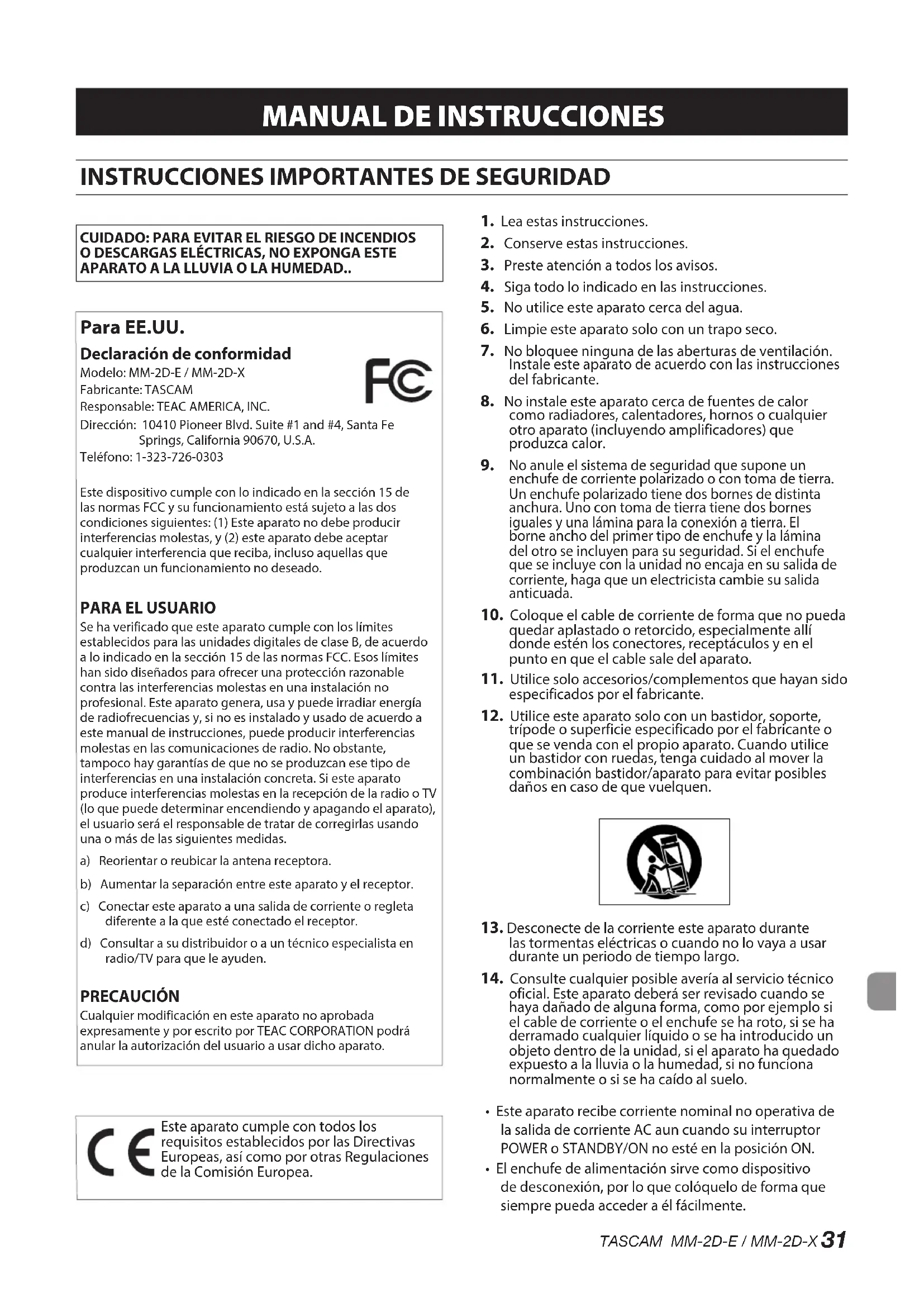 CUIDADO: PARA EVITAR EL RIESGO DE INCENDIOS O DESCARGAS ELÉCTRICAS, NO EXPONGA ESTE APARATO A LA LLUVIA O LA HUMEDAD.. Para EE.UU. Declaración de conformidad Modelo: MM-2D-E / MM-2D-XFabricante: TASCAMResponsable: TEAC AMERICA, INC.Dirección: 10410 Pioneer Blvd. Suite #1 and #4, Santa Fe Springs, California 90670, U.S.A.Teléfono: 1-323-726-0303Este dispositivo cumple con lo indicado en la sección 15 de las normas FCC y su funcionamiento está sujeto a las dos condiciones siguientes: (1) Este aparato no debe producir interferencias molestas, y (2) este aparato debe aceptar cualquier interferencia que reciba, incluso aquellas que produzcan un funcionamiento no deseado.