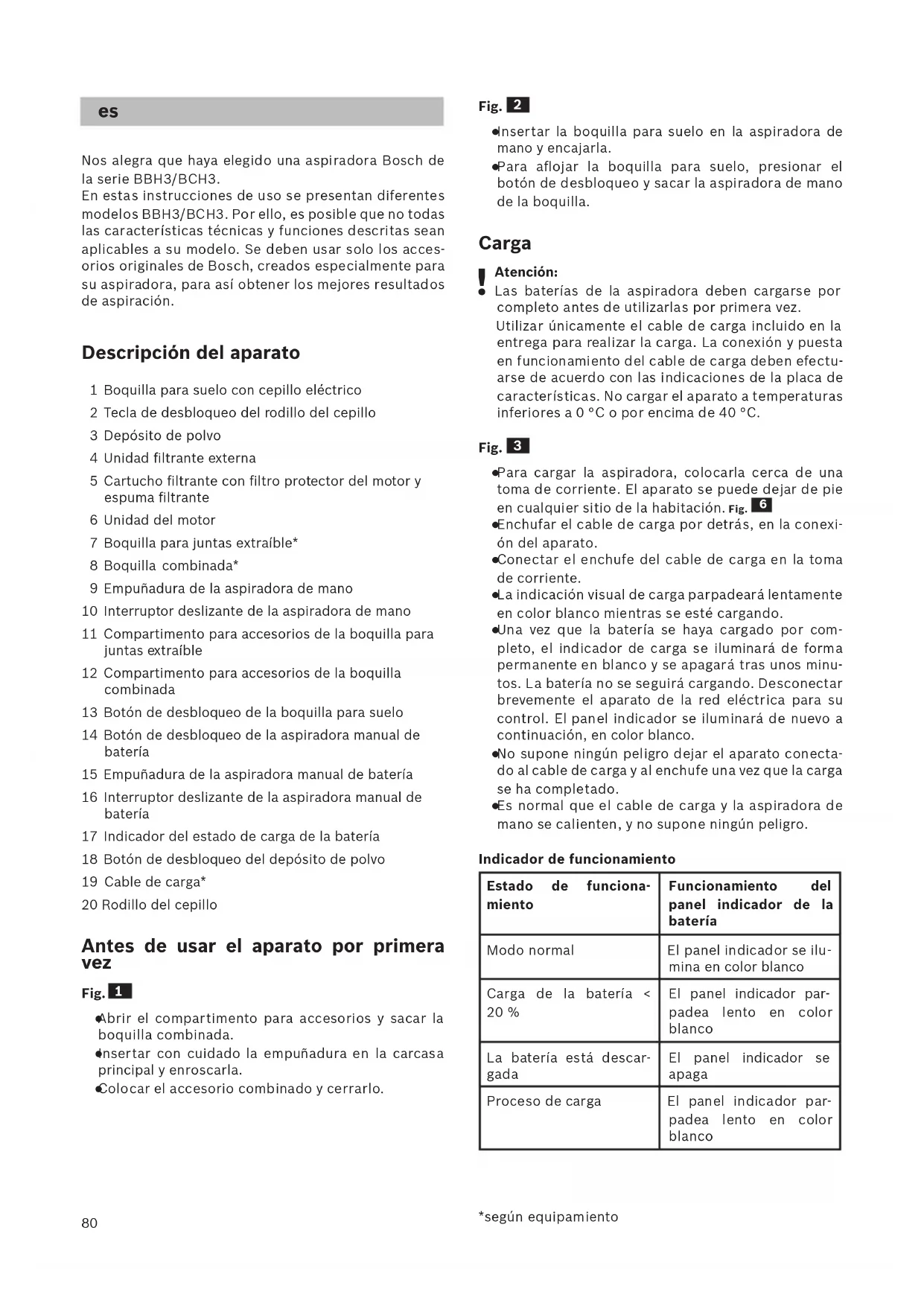 Nos alegra que haya elegido una aspiradora Bosch de la serie BBH3/BCH3. En estas instrucciones de uso se presentan diferentes mode los BBH3/BCH3. Por ello, es posible que no todas las características técnicas y funciones descritas sean aplicables a su modelo. Se deben usar solo los acces- orios originales de Bosch, creados especialmente para su aspiradora, para así obtener los mejores resultados de aspiración. Descripción del aparato 1 Boquilla para suelo con cepillo eléctrico 2 Tecla de desbloqueo del rodillo del cepillo 3 Depósito de polvo 4 Unidad filtrante externa 5 Cartucho filtrante con filtro protector del motor y espuma filtrante 6 Unidad del motor 7 Boquilla para juntas extraíble* 8 Boquilla combinada* 9 Empuñadura de la aspiradora de mano 10 Interruptor deslizante de la aspiradora de mano 11 Compartimento para accesorios de la boquilla para juntas e xtraíble 12 Compartimento para accesorios de la boquilla combinada 13 Botón de desbloqueo de la boquilla para suelo 14 Botón de desbloqueo de la aspiradora manual de batería 15 Empuñadura de la aspiradora manual de batería 16 Interruptor deslizante de la aspiradora manual de batería 17 Indicador del estado de carga de la batería 18 Botón de desbloqueo del depósito de polvo