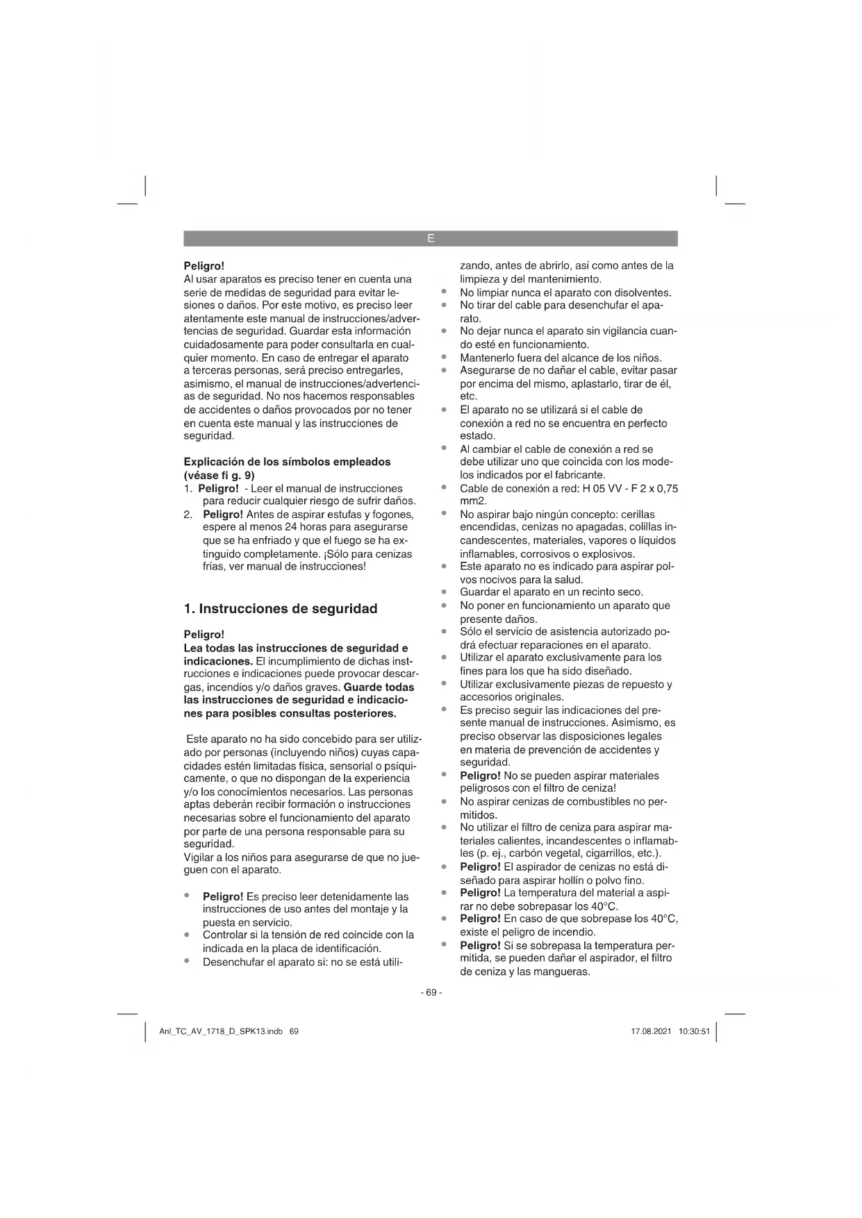 El aspirador de cenizas es adecuado para aspirar cenizas frías o residuos fríos de chimeneas, estu- fas de carbón/madera, ceniceros o barbacoas. Utilizar la máquina sólo en los casos que se indi- can explícitamente como de uso adecuado. Cual- quier otro uso no será adecuado. En caso de uso inadecuado, el fabricante no se hace responsable de daños o lesiones de cualquier tipo; el respon- sable es el usuario u operario de la máquina. Anl_TC_AV_1718_D_SPK13.indb 70Anl_TC_AV_1718_D_SPK13.indb 70 17.08.2021 10:30:5117.08.2021 10:30:51E